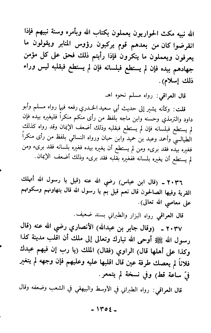 2036 - (قال ابن عباس) رضي الله عنه (قيل يا رسول الله أتهلك القرية وفيها الصالحون قال نعم قيل بم يا رسول الله قال بتهاونهم وسكوتهم على معاصي الله تعالى).