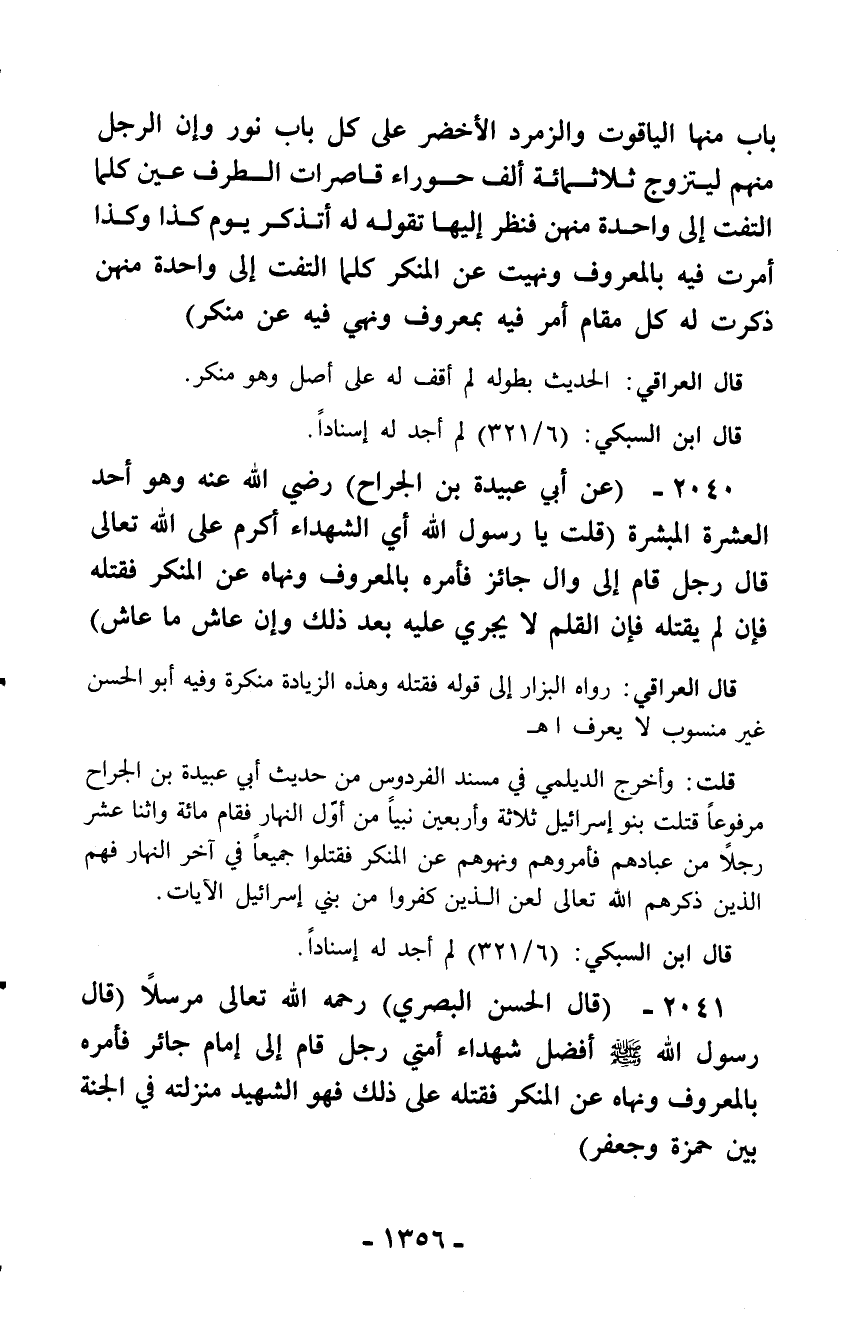 2041 - (قال الحسن البصري) رحمه الله تعالى مرسلاً (قال رسول الله - صلّى الله عليه وسلم - أفضل شهداء أمتي رجل قام إلى إمام جائر فأمره بالمعروف ونهاه عن المنكر فقتله على ذلك فهو الشهيد منزلته في الجنة بين حمزة وجعفر)