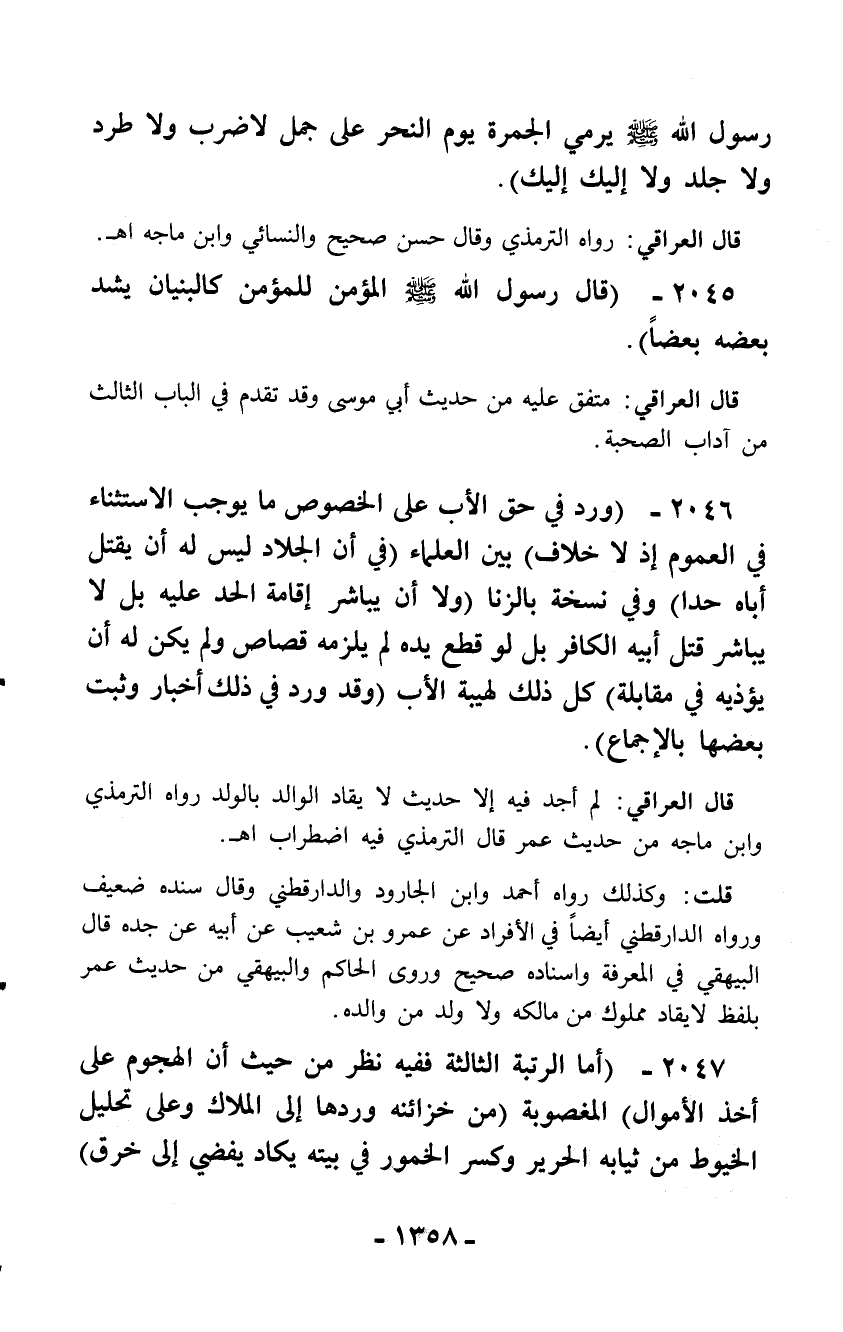 قال العراقي: لم أجد فيه إلا حديث لا يقاد الوالد بالولد رواه الترمذي وابن ماجه من حديث عمر قال الترمذي فيه اضطراب اهـ.