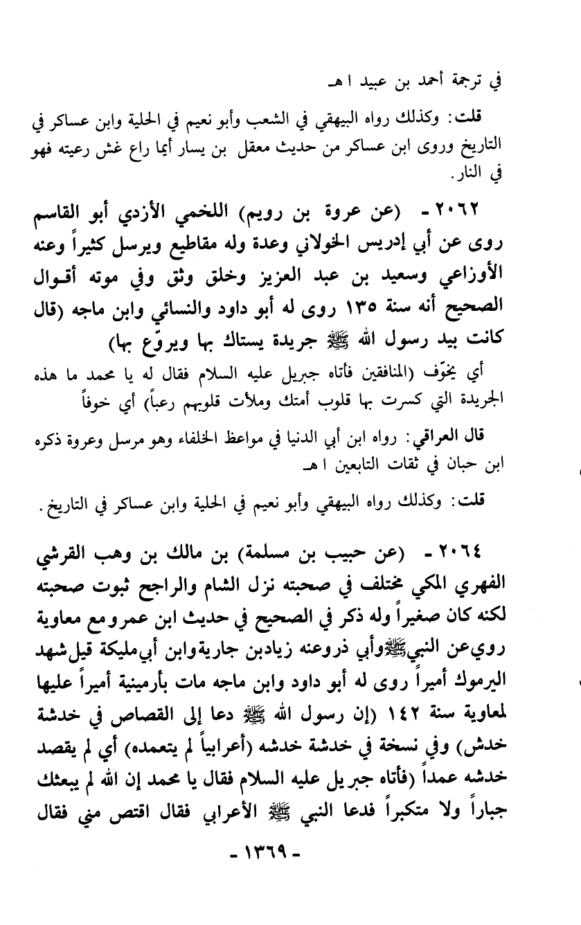 2062 - (عن عروة بن رويم) اللخمي الأزدي أبو القاسم روى عن أبي إدريس الخولاني وعدة وله مقاطيع ويرسل كثيراً وعنه الأوزاعي وسعيد بن عبد العزيز وخلق وثق وفي موته أقوال الصحيح أنه سنة 135 روى له أبو داود والنسائي وابن ماجه (قال كانت بيد رسول الله - صلّى الله عليه وسلم - جريدة يستاك بها ويروّع بها)
