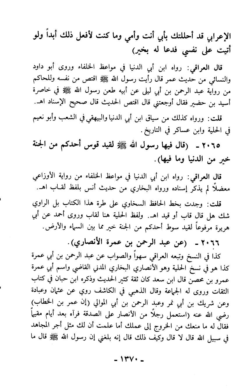 2065 - (قال فيها رسول الله - صلّى الله عليه وسلم - لقيد قوس أحدكم من الجنة خير من الدنيا وما فيها).