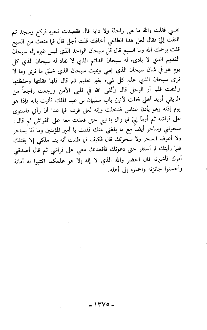 نفسي فقلت والله ما هي راحلة ولا دابة قال فقصدت نحوه فركع وسجد ثم التفت إليّ فقال لعل هذا الطاغي أخافك قلت أجل قال فما منعك من السبع قلت يرحمك الله وما السبع قال قل سبحان الواحد الذي ليس غيره إله سبحان القديم الذي لا بادئ له سبحان الدائم الذي لا نفاد له سبحان الذي كل يوم هو في شأن سبحان الذي يحي ويميت سبحان الذي خلق ما نرى وما لا نرى سبحان الذي علم كل شيء بغير تعليم ثم قال قلها فقلتها وحفظتها والتفت فلم أر الرجل قال وألقى الله في قلبي الأمن ورجعت راجعاً من طريقي أريد أهلي فقلت لآتين باب سليمان بن عبد الملك فأتيت بابه فإذا هو يوم إذنه وهو يأذن للناس فدخلت وإنه لعلى فرشه فما عدا أن رآني فاستوى على فراشه ثم أومأ إليّ فما زال يدنيني حتى قعدت معه على الفراش ثم قال: سحرتني وساحر أيضاً مع ما بلغني عنك فقلت يا أمير المؤمنين وما أنا بساحر ولا أعرف السحر ولا سحرتك قال فكيف فما ظننت أنه يتم ملكي إلا بقتلك فلما رأيتك لم أستقر حتى دعوتك فأقعدتك معي على فراشي ثم قال أصدقني أمرك فأخبرته قال الخضر والله الذي لا إله إلا هو علمكها اكتبوا له أمانة وأحسنوا جائزته واحملوه إلى أهله.