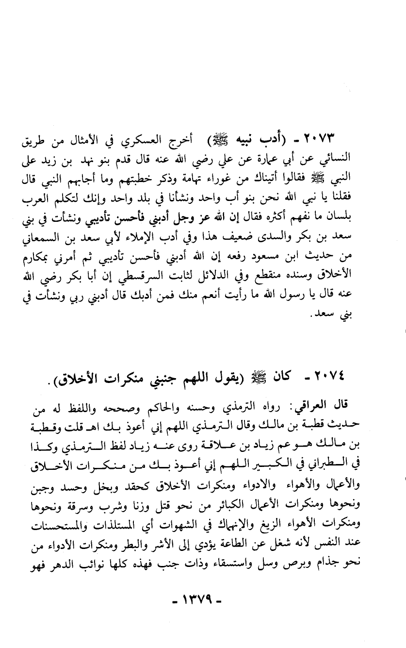 2074 - كان - صلّى الله عليه وسلم - (يقول اللهم جنبني منكرات الأخلاق).