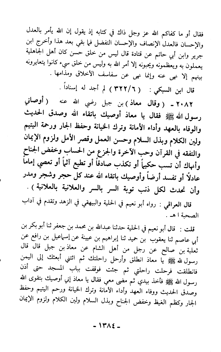 2082 - (وقال معاذ) بن جبل رضي الله عنه (أوصاني رسول الله - صلّى الله عليه وسلم - فقال يا معاذ أوصيك باتقاء الله وصدق الحديث والوفاء بالعهد وأداء الأمانة وترك الخيانة وحفظ الجار ورحمة اليتيم ولين الكلام وبذل السلام وحسن العمل وقصر الأمل ولزوم الإيمان والتفقه في القرآن وحب الآخرة والجزع من الحساب وخفض الجناح وأنهاك أن تسب حكيماً أو تكذب صادقاً أو تطيع آثماً أو تعصي إماماً عادلاً أو تفسد أرضاً وأوصيك باتقاء الله عند كل حجر وشجر ومدر وأن تحدث لكل ذنب توبة السر بالسر والعلانية بالعلانية).