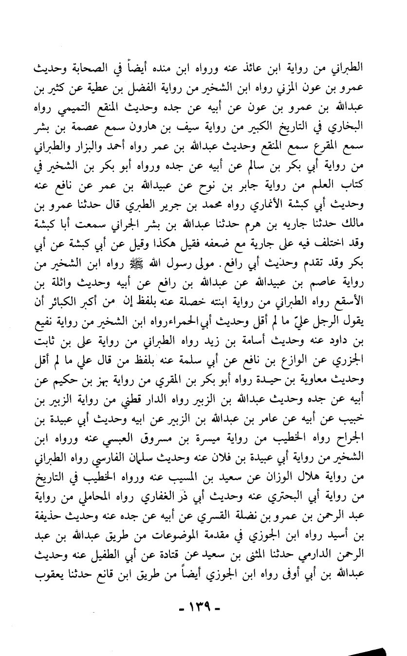 الطبراني من رواية ابن عائذ عنه ورواه ابن منده أيضاً في الصحابة وحديث عمرو بن عون المزني رواه ابن الشخير من رواية الفضل بن عطية عن كثير بن عبد الله بن عمرو بن عون عن أبيه عن جده وحديث المنقع التميمي رواه البخاري في التاريخ الكبير من رواية سيف بن هارون سمع عصمة بن بشر سمع المقرع سمع المنقع وحديث عبد الله بن عمر رواه أحمد والبزار والطبراني من رواية أبي بكر بن سالم عن أبيه عن جده ورواه أبو بكر بن الشخير في كتاب العلم من رواية جابر بن نوح عن عبيد الله بن عمر عن نافع عنه وحديث أبي كبشة الأنماري رواه محمد بن جرير الطبري قال حدثنا عمرو بن مالك حدثنا جاريه بن هرم حدثنا عبد الله بن بشر الجراني سمعت أبا كبشة وقد اختلف فيه على جارية مع ضعفه فقيل هكذا وقيل عن أبي كبشة عن أبي بكر وقد تقدم وحديث أبي رافع مولى رسول الله - صلى الله عليه وسلم - رواه ابن الشخير من رواية عاصم بن عبيد الله عن عبد الله بن رافع عن أبيه وحديث واثلة بن الأسقع رواه الطبراني من رواية ابنته خصلة عنه بلفظ إن من أكبر الكبائر أن يقول الرجل عليّ ما لم أقل وحديث أبي الحمراء رواه ابن الشخير من رواية نفيع بن داود عنه وحديث أسامة بن زيد رواه الطبراني من رواية علي بن ثابت الجزري عن الوازع بن نافع عن أبي سلمة عنه بلفظ من قال علي ما لم أقل وحديث معاوية بن حيدة رواه أبو بكر بن المقري من رواية بهز بن حكيم عن أبيه عن جده وحديث عبد الله بن الزبير رواه الدارقطني من رواية الزبير بن خبيب عن أبيه عن عامر بن عبد الله بن الزبير عن أبيه وحديث أبي عبيدة بن الجراح رواه الخطيب من رواية ميسرة بن مسروق العبسي عنه ورواه ابن الشخير من رواية أبي عبيدة بن فلان عنه وحديث سلمان الفارسي رواه الطبراني من رواية هلال الوزان عن سعيد بن المسيب عنه ورواه الخطيب في التاريخ من رواية أبي البحتري عنه وحديث أبي ذر الغفاري رواه المحاملي من رواية عبد الرحمن بن عمرو بن نضلة القسري عن أبيه عن جده عنه وحديث حذيفة بن أسيد رواه ابن الجوزي في مقدمة الموضوعات من طريق عبد الله بن عبد الرحمن الدارمي حدثنا المثنى بن سعيد عن قتادة عن أبي الطفيل عنه وحديث عبد الله بن أبي أوفى رواه ابن الجوزي أيضاً من طريق ابن قانع حدثنا يعقوب
