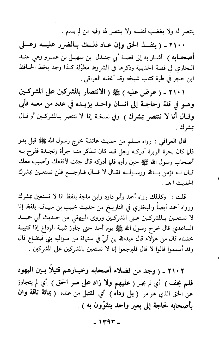 2101 - (عرض عليه) - صلّى الله عليه وسلم - (الانتصار بالمشركين على المشركين وهو في قلة وحاجة إلى إنسان واحد يزيده في عدد من معه فأبى وقال إنا لا ننتصر بمشرك) وفي نسخة إنا لا ننتصر بالمشركين أو قال بمشرك.