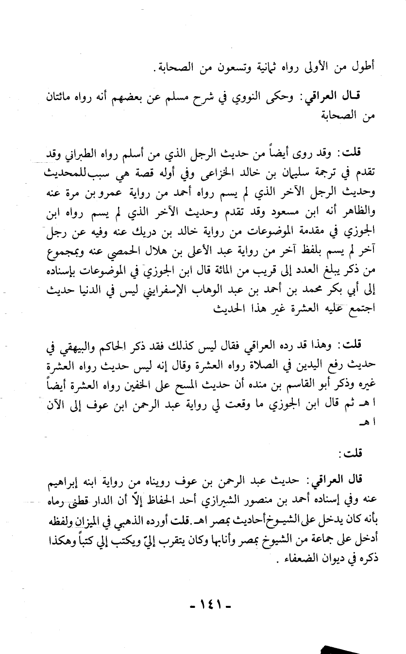 قلت: وهذا قد رده العراقي فقال ليس كذلك فقد ذكر الحاكم والبيهقي في حديث رفع اليدين في الصلاة رواه العشرة وقال إنه ليس حديث رواه العشرة غيره وذكر أبو القاسم بن منده أن حديث المسح على الخفين رواه العشرة أيضاً اهـ ثم قال ابن الجوزي ما وقعت لي رواية عبد الرحمن ابن عوف إلى الآن اهـ