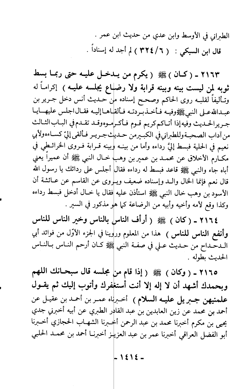 2165 - (وكان) - صلّى الله عليه وسلم - (إذا قام من مجلسه قال سبحانك اللهم وبحمدك أشهد أن لا إله إلا أنت أستغفرك وأتوب إليك ثم يقول علمنيهن جبريل عليه السلام) أخبرناه عمر بن أحمد بن عقيل عن أحمد بن محمد عن زين العابدين بن عبد القادر الطبري عن أبيه أخبرني جدي يحيى بن مكرم أخبرنا محمد بن عبد الرحمن أخبرنا الشهاب الحجازي أخبرنا أبو الفضل العراقي أخبرنا عمر بن عبد العزيز أخبرنا أحمد بن محمد الحلبي