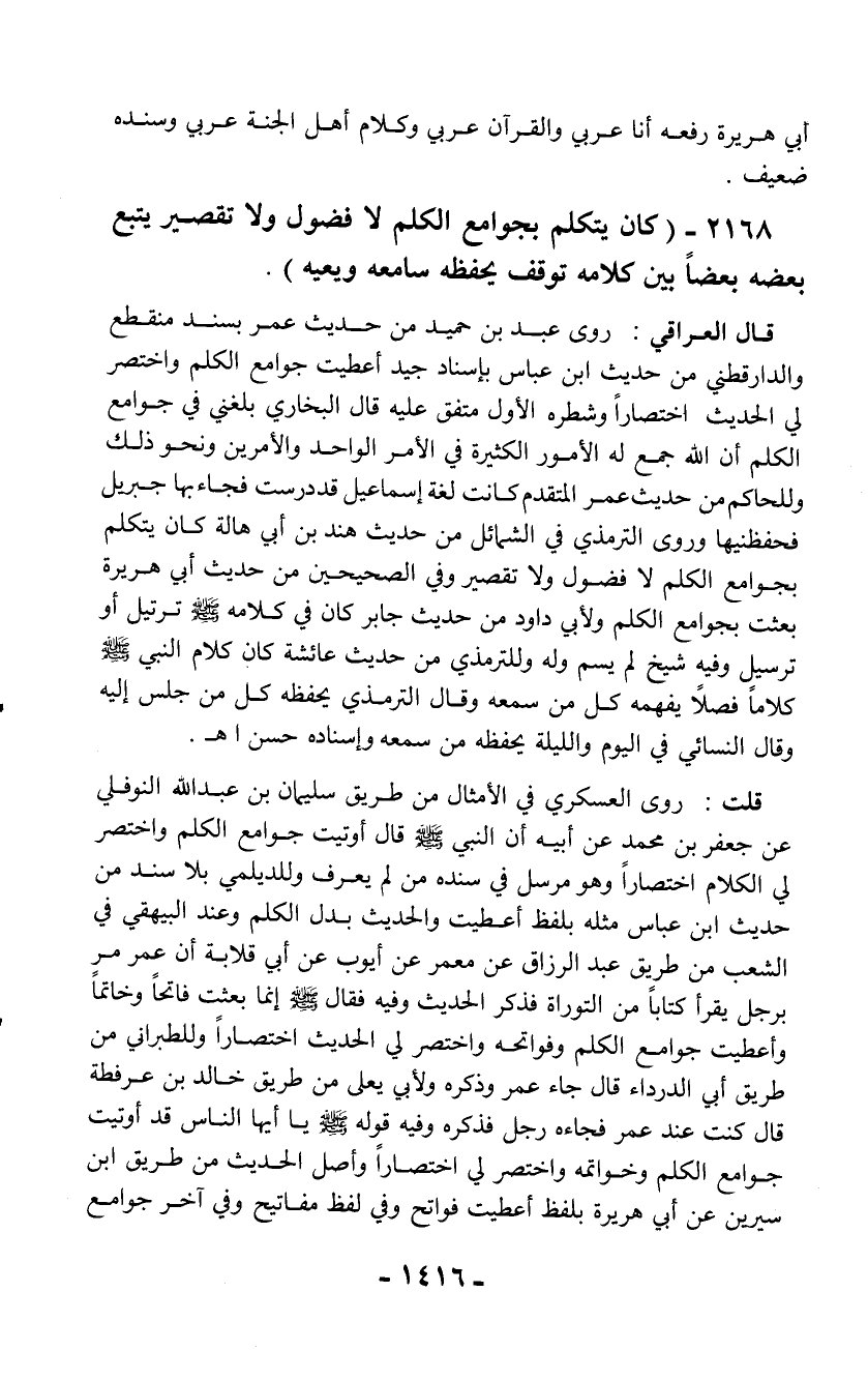 قال العراقي: روى عبد بن حميد من حديث عمر بسند منقطع والدارقطني من حديث ابن عباس بإسناد جيد أعطيت جوامع الكلم واختصر لي الحديث اختصاراً وشطره الأول متفق عليه قال البخاري بلغني في جوامع الكلم أن الله جمع له الأمور الكثيرة في الأمر الواحد والأمرين ونحو ذلك وللحاكم من حديث عمر المتقدم كانت لغة إسماعيل قد درست فجاء بها جبريل فحفظنيها وروى الترمذي في الشمائل من حديث هند بن أبي هالة كان يتكلم بجوامع الكلم لا فضول ولا تقصير وفي الصحيحين من حديث أبي هريرة بعثت بجوامع الكلم ولأبي داود من حديث جابر كان في كلامه - صلّى الله عليه وسلم - ترتيل أو ترسيل وفيه شيخ لم يسم وله وللترمذي من حديث عائشة كان كلام النبي - صلّى الله عليه وسلم - كلاماً فصلاً يفهمه كل من سمعه وقال الترمذي يحفظه كل من جلس إليه وقال النسائي في اليوم والليلة يحفظه من سمعه وإسناده حسن اهـ.