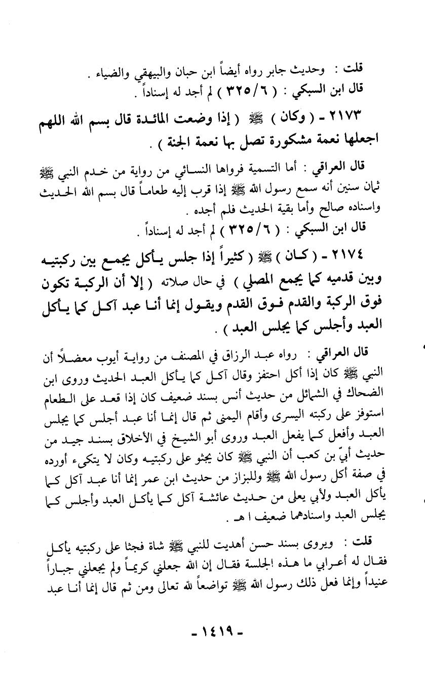 2174 - (كان) - صلّى الله عليه وسلم - (كثيراً إذا جلس يأكل يجمع بين ركبتيه وبين قدميه كما يجمع المصلى) في حال صلاته (إلا أن الركبة تكون فوق الركبة والقدم فوق القدم ويقول إنما أنا عبد آكل كما يأكل العبد وأجلس كما يجلس العبد).