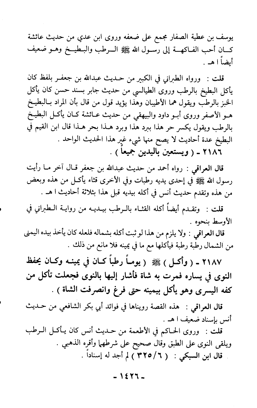 قال العراقي: ولا يلزم من هذا لو ثبت أكله بشماله فلعله كان يأخذ بيده اليمنى من الشمال رطبة رطبة فيأكلها مع ما في يمينه فلا مانع من ذلك.