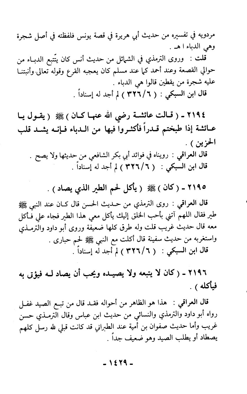 قال العراقي: روى الترمذي من حديث الحسن قال كان عند النبي - صلّى الله عليه وسلم - طير فقال اللهم آتني بأحب الخلق إليك يأكل معي هذا الطير فجاء علي فأكل معه قال حديث غريب قلت وله طرق كلها ضعيفة وروى أبو داود والترمذي واستغربه من حديث سفينة قال أكلت مع النبي - صلّى الله عليه وسلم - لحم حبارى.