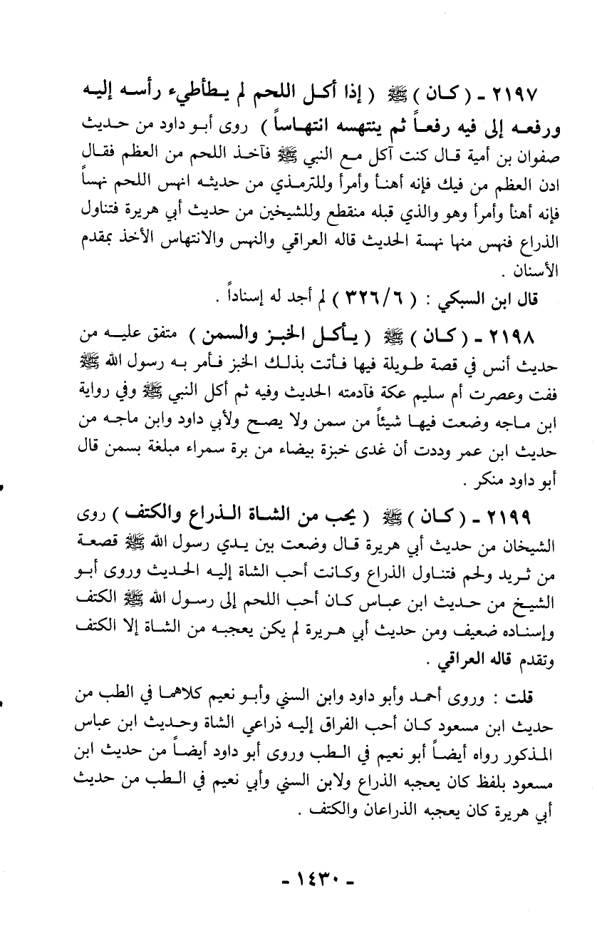 2199 - (كان) - صلّى الله عليه وسلم - (يحب من الشاة الذراع والكتف) روى الشيخان من حديث أبي هريرة قال وضعت بين يدي رسول الله - صلّى الله عليه وسلم - قصعة من ثريد ولحم فتناول الذراع وكانت أحب الشاة إليه الحديث وروى أبو الشيخ من حديث ابن عباس كان أحب اللحم إلى رسول الله - صلّى الله عليه وسلم - الكتف وإسناده ضعيف ومن حديث أبي هريرة لم يكن يعجبه من الشاة إلا الكتف وتقدم قاله العراقي.