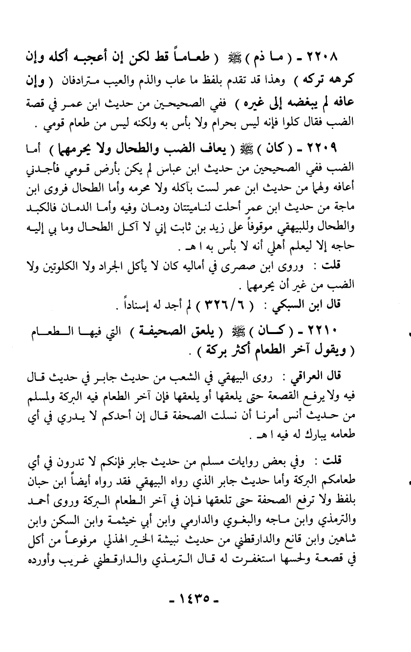 2209 - (كان) - صلّى الله عليه وسلم - (يعاف الضب والطحال ولا يحرمهما) أما الضب ففي الصحيحين من حديث ابن عباس لم يكن بأرض قومي فأجدني أعافه ولهما من حديث ابن عمر لست بآكله ولا محرمه وأما الطحال فروى ابن ماجة من حديث ابن عمر أحلت لناميتتان ودمان وفيه وأما الدمان فالكبد والطحال وللبيهقي موقوفاً على زيد بن ثابت إني لا آكل الطحال وما بي إليه حاجه إلا ليعلم أهلي أنه لا بأس به اهـ.