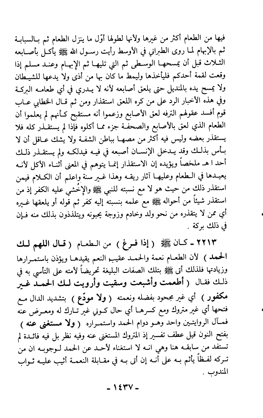 2213 - كان - صلّى الله عليه وسلم - (إذا فرغ) من الطعام (قال اللهم لك الحمد) لأن الطعام نعمة والحمد عقيب النعم يقيدها ويؤذن باستمرارها وزيادتها فلذلك أتى - صلّى الله عليه وسلم - بتلك الصفات البليغة تحريضاً لأمته على التأسي به في ذلك فقال (أطعمت وأشبعت وسقيت وأرويت لك الحمد غير مكفور) أي غير مجحود بفضله ونعمته (ولا مودّع) بتشديد الدال مع فتحها أي غير متروك ومع كسرها أي حال كوني غير تارك له ومعرض عنه فمآل الروايتين واحد وهو دوام الحمد واستمراره (ولا مستغنى عنه) بفتح النون قيل عطف تفسير إذ المتروك المستغنى عنه وفيه نظر بل فيه فائدة لم تستفد من سابقه هنا وهي أنه لا استغناء لأحد عن الحمد لوجوبه أن من تركه لفظاً يأثم به على أنه إن أتى به في مقابلة النعمة أثيب عليه ثواب المندوب.