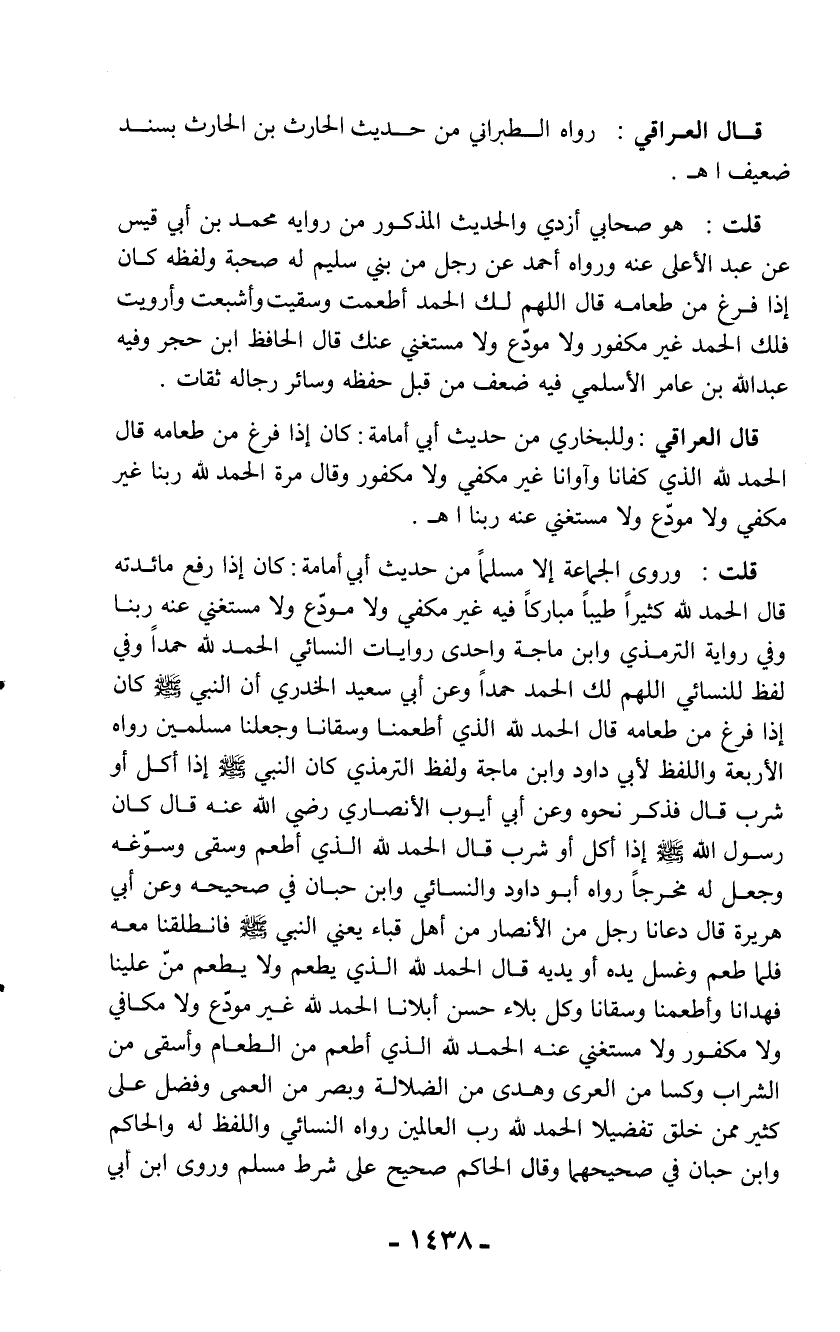 قلت: وروى الجماعة إلا مسلماً من حديث أبي أمامة: كان إذا رفع مائدته قال الحمد لله كثيراً طيباً مباركاً فيه غير مكفي ولا مودّع ولا مستغني عنه ربنا وفي رواية الترمذي وابن ماجة وإحدى روايات النسائي الحمد لله حمداً وفي لفظ للنسائي اللهم لك الحمد حمداً وعن أبي سعيد الخدري أن النبي - صلّى الله عليه وسلم - كان إذا فرغ من طعامه قال الحمد لله الذي أطعمنا وسقانا وجعلنا مسلمين رواه الأربعة واللفظ لأبي داود وابن ماجة ولفظ الترمذي كان النبي - صلّى الله عليه وسلم - إذا أكل أو شرب قال فذكر نحوه وعن أبي أيوب الأنصاري رضي الله عنه قال كان رسول الله - صلّى الله عليه وسلم - إذا أكل أو شرب قال الحمد لله الذي أطعم وسقى وسوّغه وجعل له مخرجاً رواه أبو داود والنسائي وابن حبان في صحيحه وعن أبي هريرة قال دعانا رجل من الأنصار من أهل قباء يعني النبي - صلّى الله عليه وسلم - فانطلقنا معه فلما طعم وغسل يده أو يديه قال الحمد لله الذي يطعم ولا يطعم منّ علينا فهدانا وأطعمنا وسقانا وكل بلاء حسن أبلانا الحمد لله غير مودّع ولا مكافي ولا مكفور ولا مستغني عنه الحمد لله الذي أطعم من الطعام وأسقى من الشراب وكسا من العرى وهدى من الضلالة وبصر من العمى وفضل على كثير ممن خلق تفضيلا الحمد لله رب العالمين رواه النسائي واللفظ له والحاكم وابن حبان في صحيحهما وقال الحاكم صحيح على شرط مسلم وروى ابن أبي