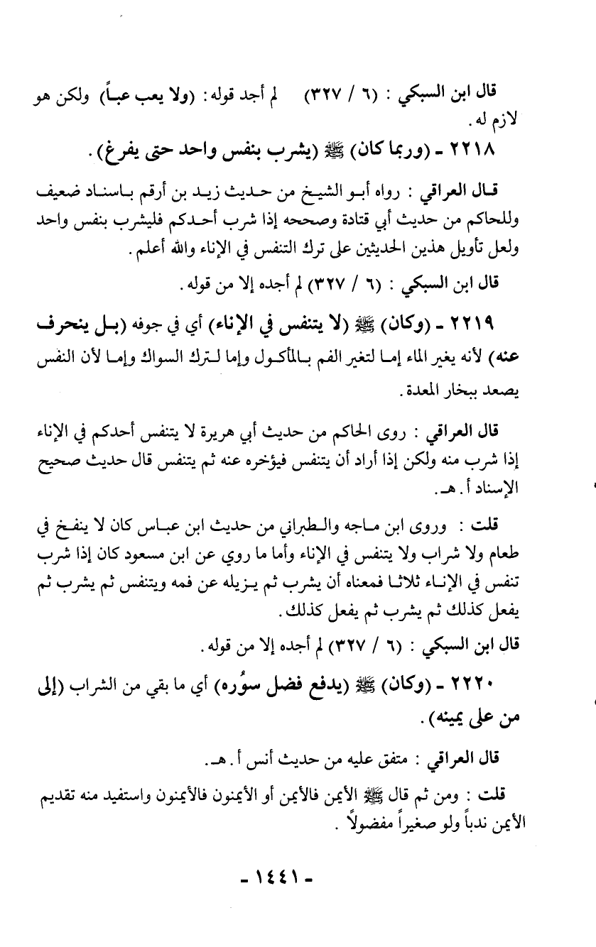 2218 - (وربما كان) - صلّى الله عليه وسلم - (يشرب بنفس واحد حتى يفرغ).