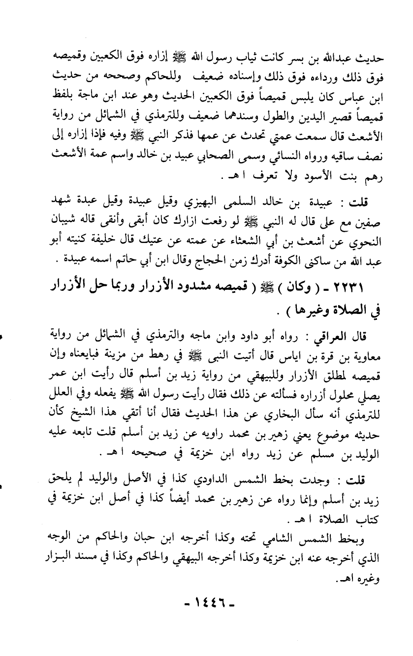 2231 - (وكان) - صلّى الله عليه وسلم - (قميصه مشدود الأزرار وربما حل الأزرار في الصلاة وغيرها).