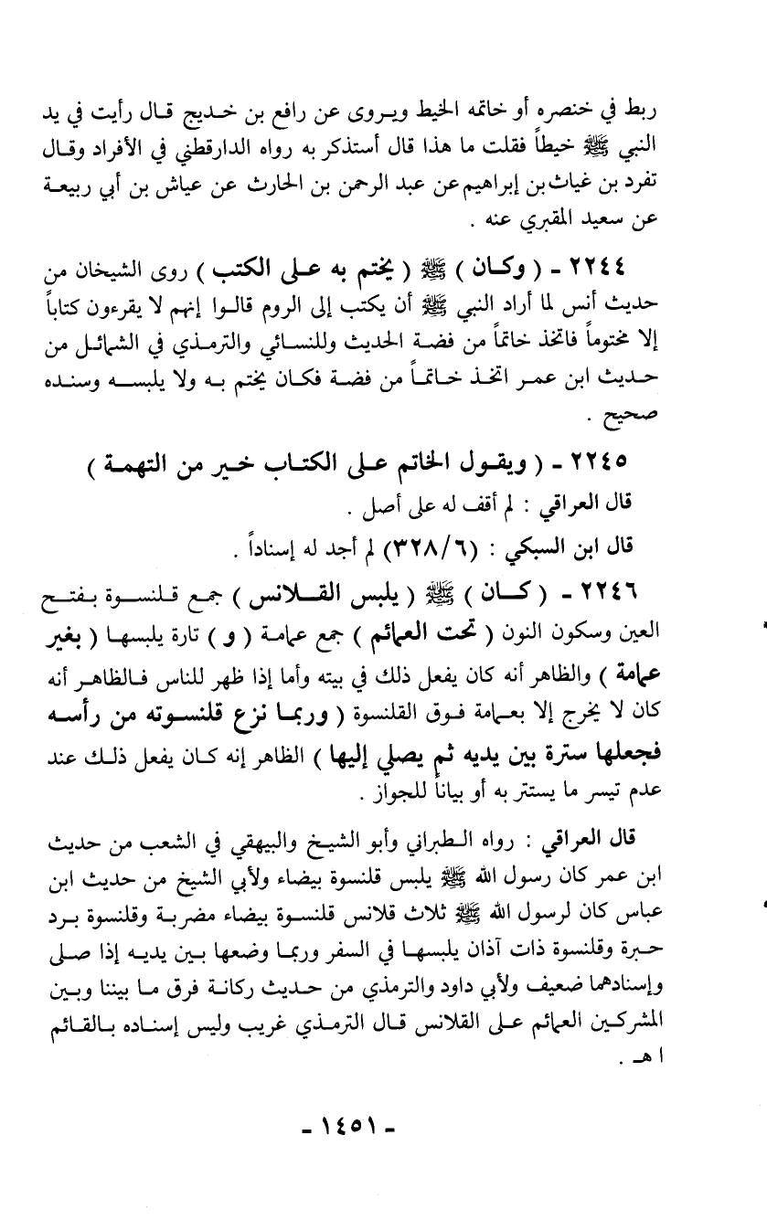 2246 - (كان) - صلّى الله عليه وسلم - (يلبس القلانس) جمع قلنسوة بفتح العين وسكون النون (تحت العمائم) جمع عمامة (و) تارة يلبسها (بغير عمامة) والظاهر أنه كان يفعل ذلك في بيته وأما إذا ظهر للناس فالظاهر أنه كان لا يخرج إلا بعمامة فوق القلنسوة (وربما نزع قلنسوته من رأسه فجعلها سترة بين يديه ثم يصلي إليها) الظاهر إنه كان يفعل ذلك عند عدم تيسر ما يستتر به أو بياناً للجواز.