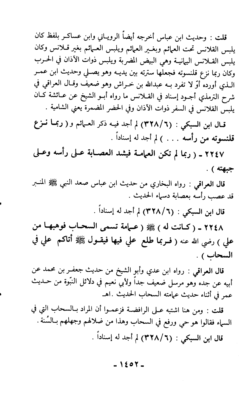 قال ابن السبكي: (6/ 328) لم أجد فيه ذكر العمائم و (ربما نزع قلنسوته من رأسه ... ) لم أجد له إسناداً.