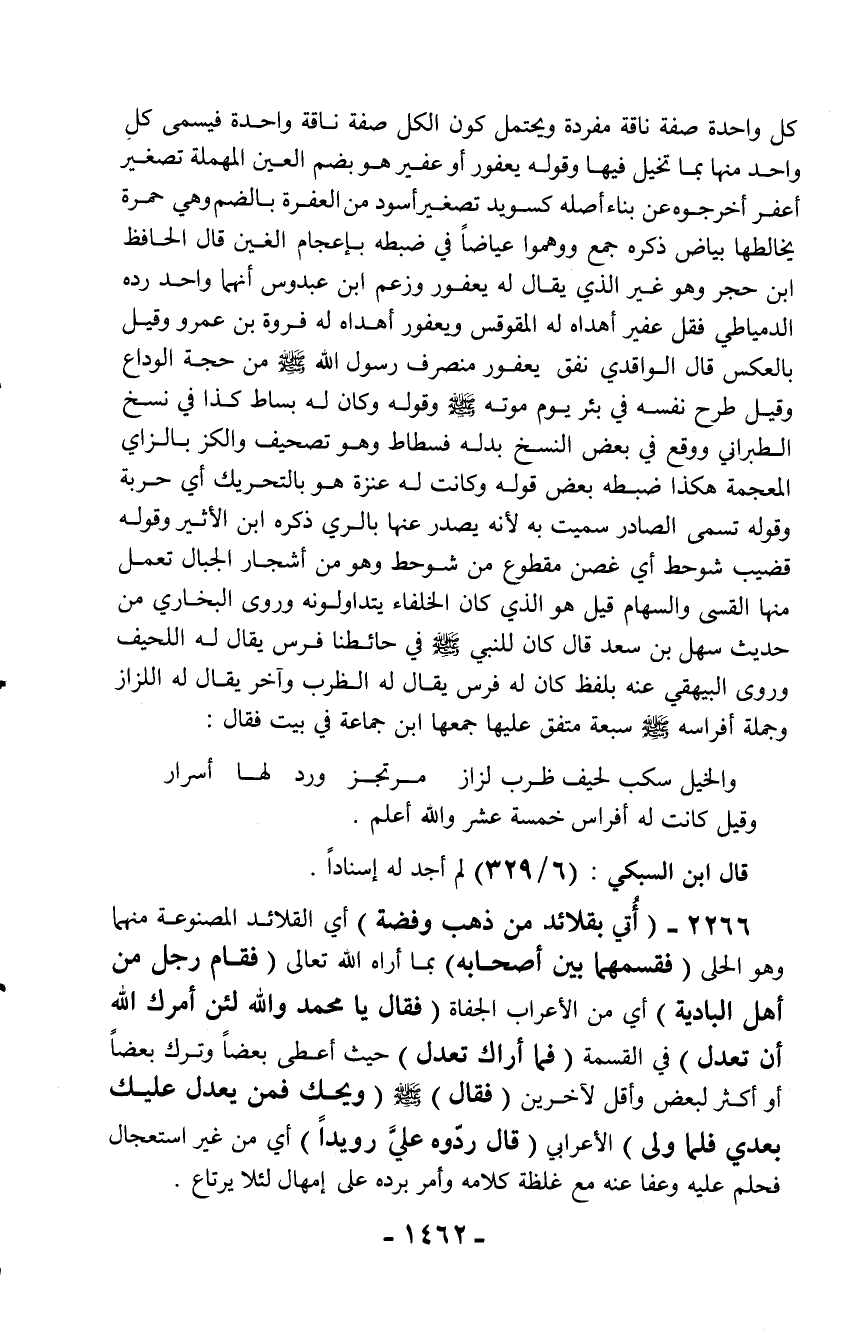 2266 - (أُتي بقلائد من ذهب وفضة) أي القلائد المصنوعة منهما وهو الحلى (فقسمهما بين أصحابه) بما أراه الله تعالى (فقام رجل من أهل البادية) أي من الأعراب الجفاة (فقال يا محمد والله لئن أمرك الله أن تعدل) في القسمة (فما أراك تعدل) حيث أعطى بعضاً وترك بعضاً أو أكثر لبعض وأقل لآخرين (فقال) - صلّى الله عليه وسلم - (ويحك فمن يعدل عليك بعدي فلما ولى) الأعرابي (قال ردّوه عليَّ رويداً) أي من غير استعجال فحلم عليه وعفا عنه مع غلظة كلامه وأمر برده على إمهال لئلا يرتاع.