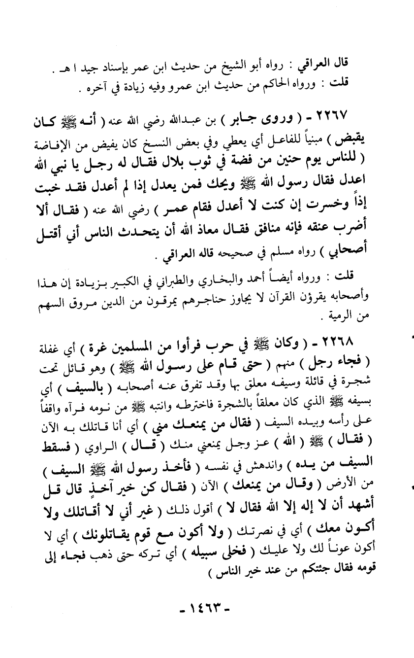 2267 - (وروى جابر) بن عبد الله رضي الله عنه (أنه - صلّى الله عليه وسلم - كان يقبض) مبنياً للفاعل أي يعطي وفي بعض النسخ كان يفيض من الإفاضة (للناس يوم حنين من فضة في ثوب بلال فقال له رجل يا نبي الله اعدل فقال رسول الله - صلّى الله عليه وسلم - ويحك فمن يعدل إذا لم أعدل فقد خبت إذاً وخسرت إن كنت لا أعدل فقام عمر) رضي الله عنه (فقال ألا أضرب عنقه فإنه منافق فقال معاذ الله أن يتحدث الناس أني أقتل أصحابي) رواه مسلم في صحيحه قاله العراقي.