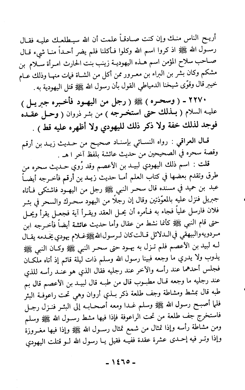 2270 - (وسحره) - صلّى الله عليه وسلم - (رجل من اليهود فأخبره جبريل) عليه السلام (بذلك حتى استخرجه) من بئر ذروان (وحل عقده فوجد لذلك خفة ولا ذكر ذلك لليهودي ولا أظهره عليه قط).