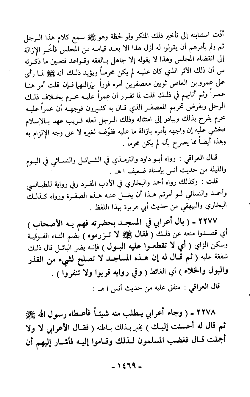 2277 - (بال أعرابي في المسجد بحضرته فهم به الأصحاب) أي قصدوا منعه عن ذلك (فقال - صلّى الله عليه وسلم - لا تزرموه) بضم التاء الفوقية وسكن الزاي (أي لا تقطعوا عليه البول) فإنه يضر البائل قال ذلك شفقة عليه (ثم قال له إن هذه المساجد لا تصلح لشيء من القذر والبول والخلاء) أي الغائط (وفي روايه قربوا ولا تنفروا).