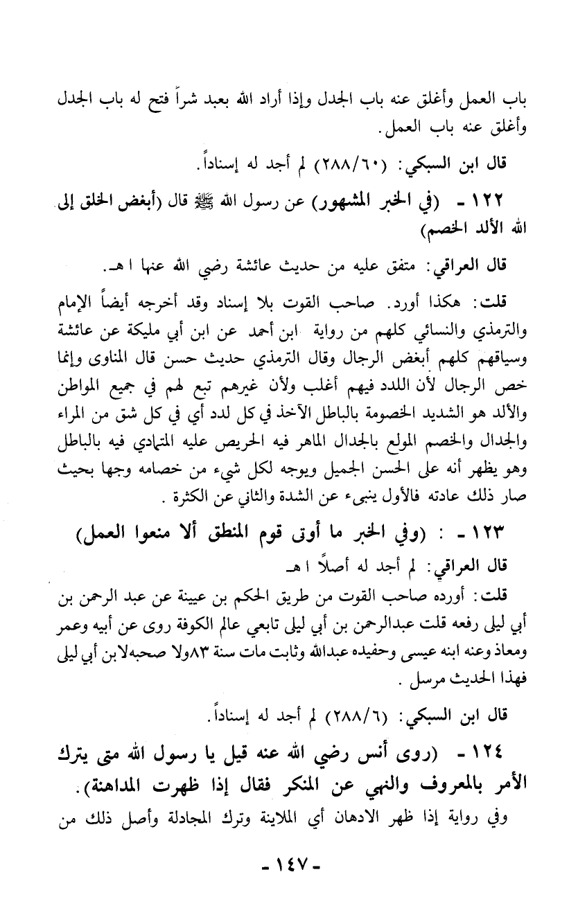 122 - (في الخبر المشهور) عن رسول الله - صلى الله عليه وسلم - قال (أبغض الخلق إلى الله الألد الخصم)