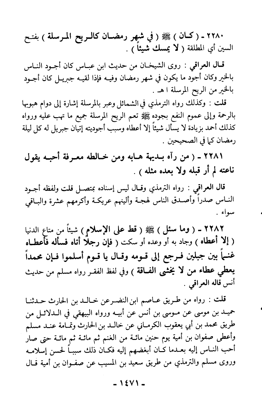 2280 - (كان) - صلّى الله عليه وسلم - (في شهر رمضان كالريح المرسلة) بفتح السين أي المطلقة (لا يمسك شيئاً)