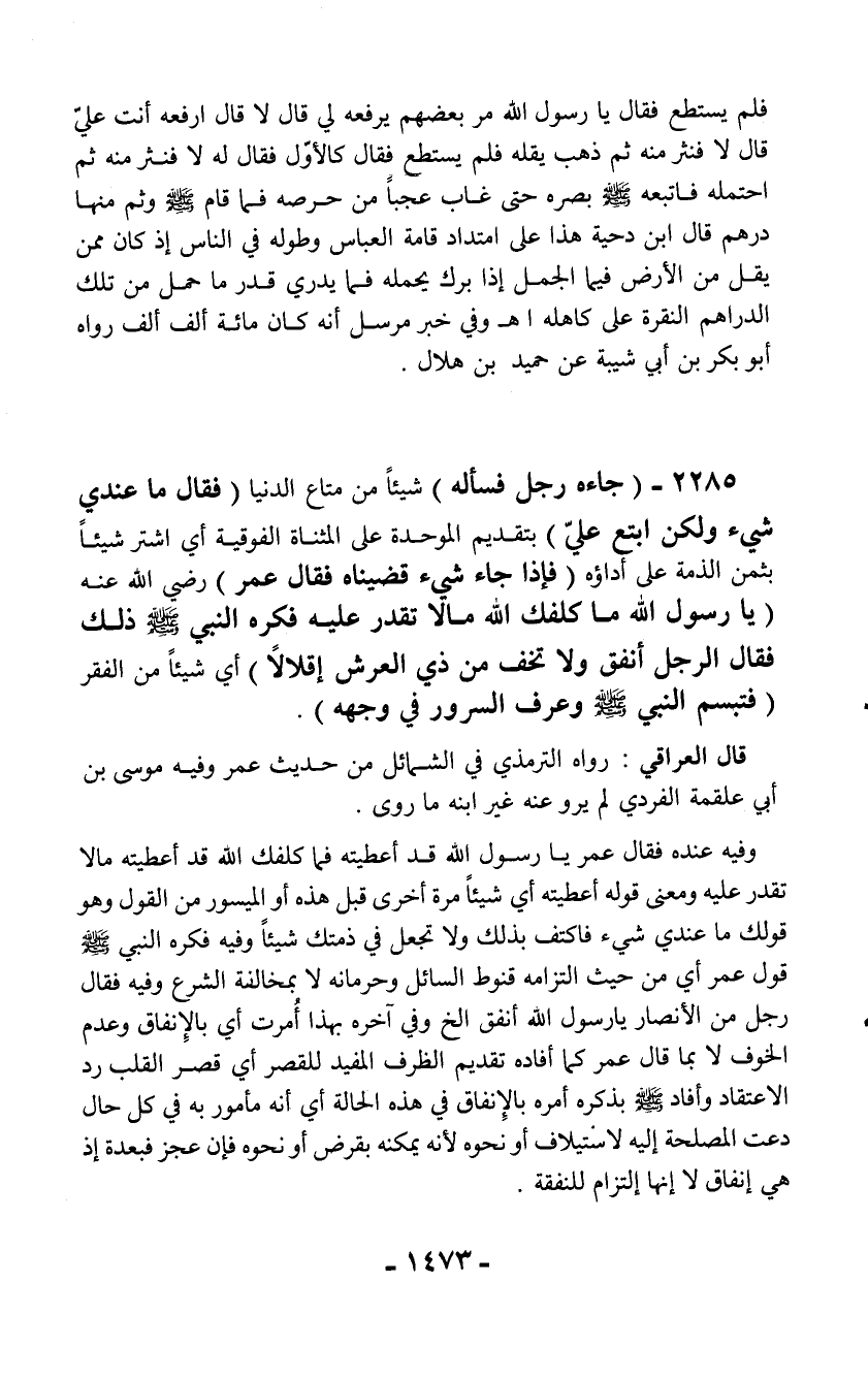2285 - (جاءه رجل فسأله) شيئاً من متاع الدنيا (فقال ما عندي شيء ولكن ابتع عليّ) بتقديم الموحدة على المثناة الفوقية أي اشتر شيئاً بثمن الذمة على أداؤه (فإذا جاء شيء قضيناه فقال عمر) رضي الله عنه (يا رسول الله ما كلفك الله ما لا تقدر عليه فكره النبي - صلّى الله عليه وسلم - ذلك فقال الرجل أنفق ولا تخف من ذي العرش إقلالاً) أي شيئاً من الفقر (فتبسم النبي - صلّى الله عليه وسلم - وعرف السرور في وجهه).