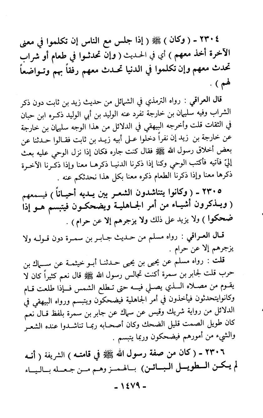 2305 - (وكانوا يتناشدون الشعر بين يديه أحياناً) فيسمعهم (ويذكرون أشياء من أمر الجاهلية ويضحكون فيتبسم هو إذا ضحكوا) ولا يزيد على ذلك ولا يزجرهم إلا عن حرام).