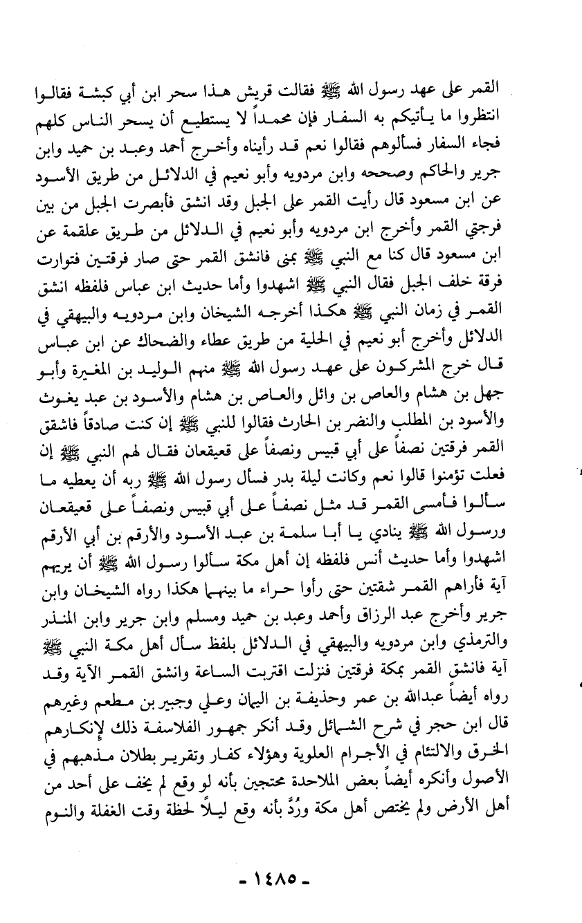 القمر على عهد رسول الله - صلّى الله عليه وسلم - فقالت قريش هذا سحر ابن أبي كبشة فقالوا انتظروا ما يأتيكم به السفار فإن محمداً لا يستطيع أن يسحر الناس كلهم فجاء السفار فسألوهم فقالوا نعم قد رأيناه وأخرج أحمد وعبد بن حميد وابن جرير والحاكم وصححه وابن مردويه وأبو نعيم في الدلائل من طريق الأسود عن ابن مسعود قال رأيت القمر على الجبل وقد انشق فأبصرت الجبل من بين فرجتي القمر وأخرج ابن مردويه وأبو نعيم في الدلائل من طريق علقمة عن ابن مسعود قال كنا مع النبي - صلّى الله عليه وسلم - بمنى فانشق القمر حتى صار فرقتين فتوارت فرقة خلف الجبل فقال النبي - صلّى الله عليه وسلم - اشهدوا وأما حديث ابن عباس فلفظه انشق القمر في زمان النبي - صلّى الله عليه وسلم - هكذا أخرجه الشيخان وابن مردويه والبيهقي في الدلائل وأخرج أبو نعيم في الحلية من طريق عطاء والضحاك عن ابن عباس قال خرج المشركون على عهد رسول الله - صلّى الله عليه وسلم - منهم الوليد بن المغيرة وأبو جهل بن هشام والعاص بن وائل والعاص بن هشام والأسود بن عبد يغوث والأسود بن المطلب والنضر بن الحارث فقالوا للنبي - صلّى الله عليه وسلم - إن كنت صادقاً فاشقق القمر فرقتين نصفاً على أبي قبيس ونصفاً على قعيقعان فقال لهم النبي - صلّى الله عليه وسلم - إن فعلت تؤمنوا قالوا نعم وكانت ليلة بدر فسأل رسول الله - صلّى الله عليه وسلم - ربه أن يعطيه ما سألوا فأمسى القمر قد مثل نصفاً على أبي قبيس ونصفاً على قعيقعان ورسول الله - صلّى الله عليه وسلم - ينادي يا أبا سلمة بن عبد الأسود والأرقم بن أبي الأرقم اشهدوا وأما حديث أنس فلفظه إن أهل مكة سألوا رسول الله - صلّى الله عليه وسلم - أن يريهم آية فأراهم القمر شقتين حتى رأوا حراء ما بينهما هكذا رواه الشيخان وابن جرير وأخرج عبد الرزاق وأحمد وعبد بن حميد ومسلم وابن جرير وابن المنذر والترمذي وابن مردويه والبيهقي في الدلائل بلفظ سأل أهل مكة النبي - صلّى الله عليه وسلم - آية فانشق القمر بمكة فرقتين فنزلت اقتربت الساعة وانشق القمر الآية وقد رواه أيضاً عبد الله بن عمر وحذيفة بن اليمان وعلي وجبير بن مطعم وغيرهم قال ابن حجر في شرح الشمائل وقد أنكر جمهور الفلاسفة ذلك لإنكارهم الخرق والالتئام في الأجرام العلوية وهؤلاء كفار وتقرير بطلان مذهبهم في الأصول وأنكره أيضاً بعض الملاحدة محتجين بأنه لو وقع لم يخف على أحد من أهل الأرض ولم يختص أهل مكة ورُدَّ بأنه وقع ليلاً لحظة وقت الغفلة والنوم