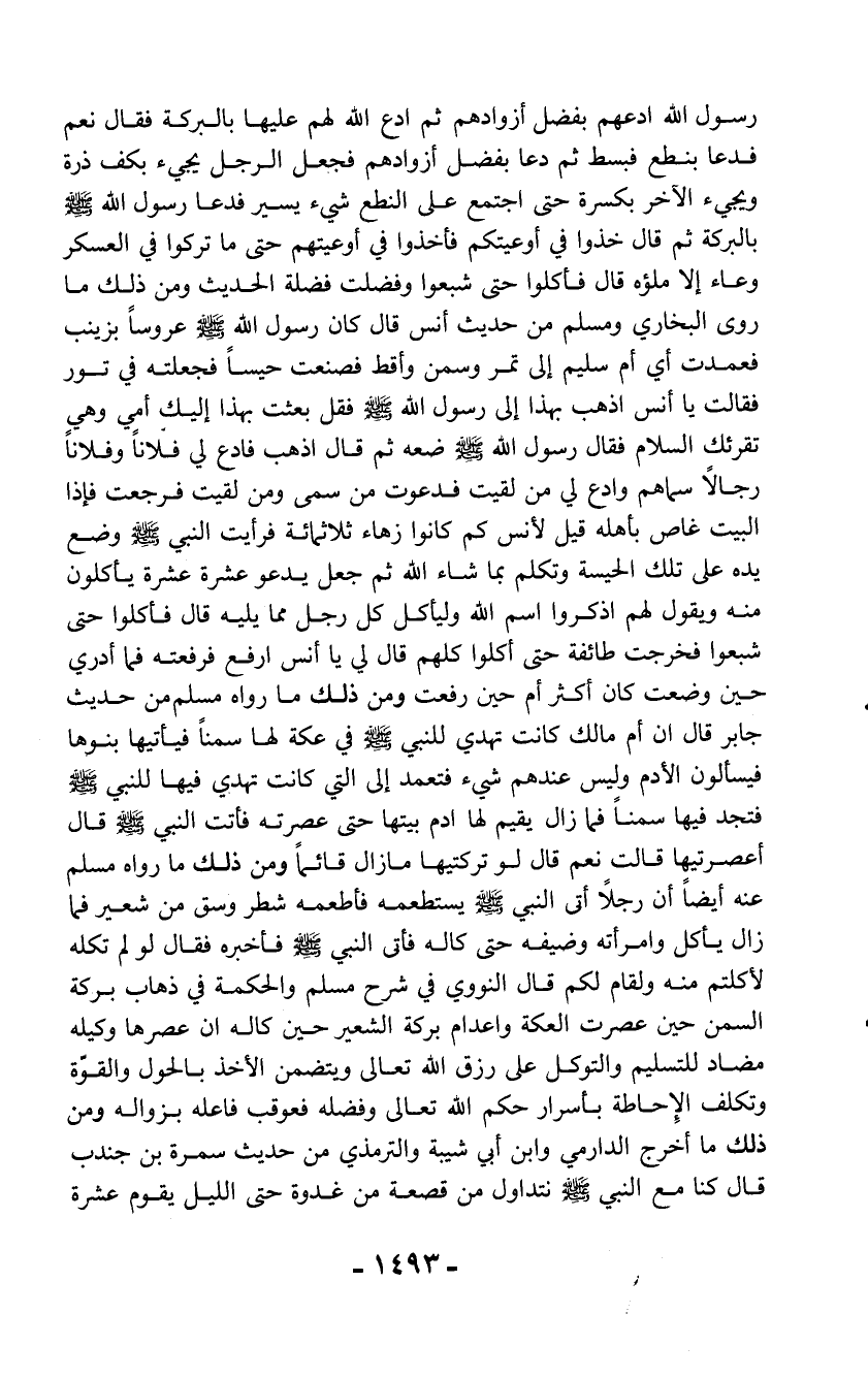 رسول الله ادعهم بفضل أزوادهم ثم ادع الله لهم عليها بالبركة فقال نعم فدعا بنطع فبسط ثم دعا بفضل أزوادهم فجعل الرجل يجيء بكف ذرة ويجيء الآخر بكسرة حتى اجتمع على النطع شيء يسير فدعا رسول الله - صلّى الله عليه وسلم - بالبركة ثم قال خذوا في أوعيتكم فأخذوا في أوعيتهم حتى ما تركوا في العسكر وعاء إلا ملؤه قال فأكلوا حتى شبعوا وفضلت فضلة الحديث ومن ذلك ما روى البخاري ومسلم من حديث أنس قال كان رسول الله - صلّى الله عليه وسلم - عروساً بزينب فعمدت أي أم سليم إلى تمر وسمن وأقط فصنعت حيساً فجعلته في تور فقالت يا أنس اذهب بهذا إلى رسول الله - صلّى الله عليه وسلم - فقل بعثت بهذا إليك أمي وهي تقرئك السلام فقال رسول الله - صلّى الله عليه وسلم - ضعه ثم قال اذهب فادع لي فلاناً وفلاناً رجالاً سماهم وادع لي من لقيت فدعوت من سمى ومن لقيت فرجعت فإذا البيت غاص بأهله قيل لأنس كم كانوا زهاء ثلاثمائة فرأيت النبي - صلّى الله عليه وسلم - وضع يده على تلك الحيسة وتكلم بما شاء الله ثم جعل يدعو عشرة عشرة يأكلون منه ويقول لهم اذكروا اسم الله وليأكل كل رجل مما يليه قال فأكلوا حتى شبعوا فخرجت طائفة حتى أكلوا كلهم قال لي يا أنس ارفع فرفعته فما أدري حين وضعت كان أكثر أم حين رفعت ومن ذلك ما رواه مسلم من حديث جابر قال أن أم مالك كانت تهدي للنبي - صلّى الله عليه وسلم - في عكة لها سمناً فيأتيها بنوها فيسألون الأدم وليس عندهم شيء فتعمد إلى التي كانت تهدي فيها للنبي - صلّى الله عليه وسلم - فتجد فيها سمناً فما زال يقيم لها أدم بيتها حتى عصرته فأتت النبي - صلّى الله عليه وسلم - قال أعصرتيها قالت نعم قال لو تركتيها ما زال قائماً ومن ذلك ما رواه مسلم عنه أيضاً أن رجلاً أتى النبي - صلّى الله عليه وسلم - يستطعمه فأطعمه شطر وسق من شعير فما زال يأكل وامرأته وضيفه حتى كاله فأتى النبي - صلّى الله عليه وسلم - فأخبره فقال لو لم تكله لأكلتم منه ولقام لكم قال النووي في شرح مسلم والحكمة في ذهاب بركة السمن حين عصرت العكة وإعدام بركة الشعير حين كاله أن عصرها وكيله مضاد للتسليم والتوكل على رزق الله تعالى ويتضمن الأخذ بالحول والقوّة وتكلف الإحاطة بأسرار حكم الله تعالى وفضله فعوقب فاعله بزواله ومن ذلك ما أخرج الدارمي وابن أبي شيبة والترمذي من حديث سمرة بن جندب قال كنا مع النبي - صلّى الله عليه وسلم - نتداول من قصعة من غدوة حتى الليل يقوم عشرة