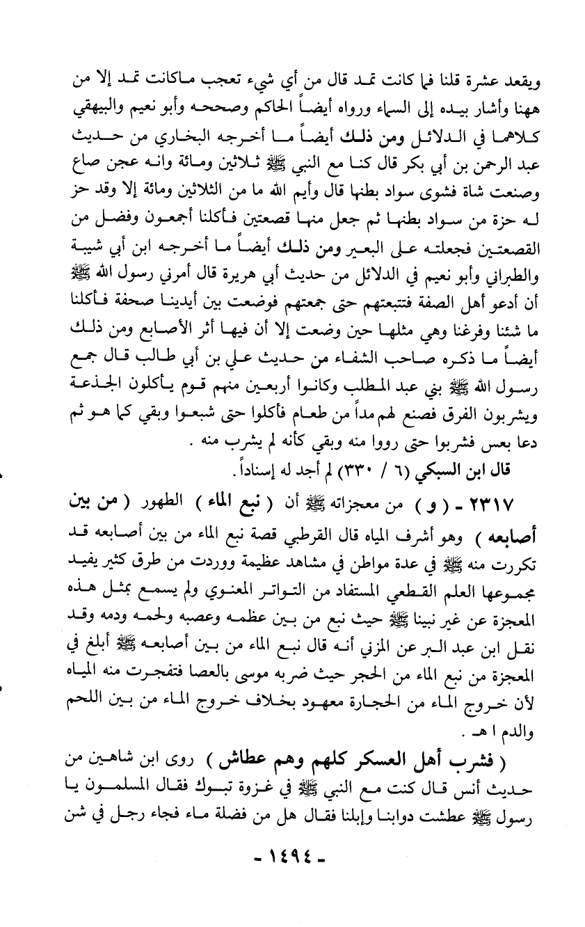 2317 - (و) من معجزاته - صلّى الله عليه وسلم - أن (نبع الماء) الطهور (من بين اُصابعه) وهو أشرف المياه قال القرطبي قصة نبع الماء من بين أصابعه قد تكررت منه - صلّى الله عليه وسلم - في عدة مواطن في مشاهد عظيمة ووردت من طرق كثير يفيد مجموعها العلم القطعي المستفاد من التواتر المعنوي ولم يسمع بمثل هذه المعجزة عن غير نبينا - صلّى الله عليه وسلم - حيث نبع من بين عظمه وعصبه ولحمه ودمه وقد نقل ابن عبد البر عن المزني أنه قال نبع الماء من بين أصابعه - صلّى الله عليه وسلم - أبلغ في المعجزة من نبع الماء من الحجر حيث ضربه موسى بالعصا فتفجرت منه المياه لأن خروج الماء من الحجارة معهود بخلاف خروج الماء من بين اللحم والدم اهـ.