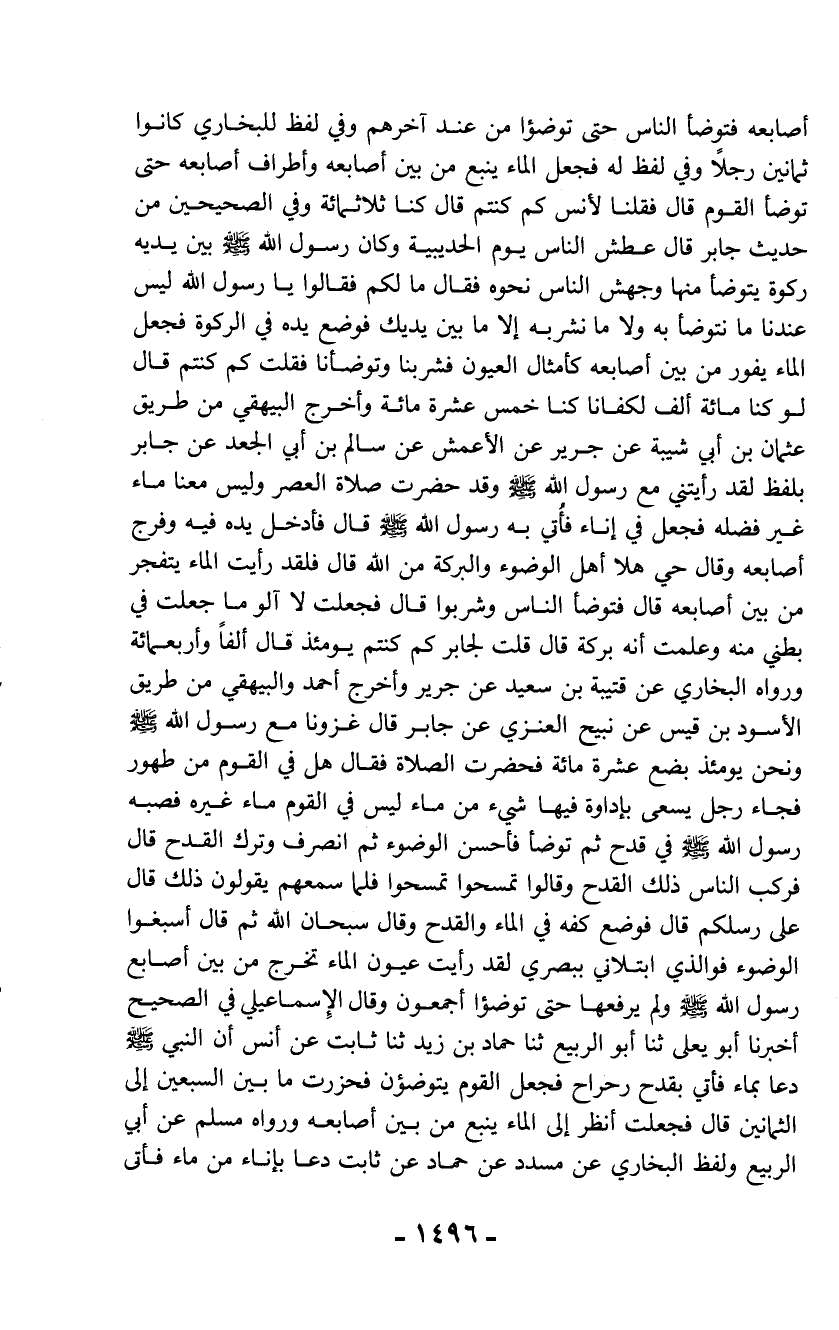 أصابعه فتوضأ الناس حتى توضؤا من عند آخرهم وفي لفظ للبخاري كانوا ثمانين رجلاً وفي لفظ له فجعل الماء ينبع من بين أصابعه وأطراف أصابعه حتى توضأ القوم قال فقلنا لأنس كم كنتم قال كنا ثلاثمائة وفي الصحيحين من حديث جابر قال عطش الناس يوم الحديبية وكان رسول الله - صلّى الله عليه وسلم - بين يديه ركوة يتوضأ منها وجهش الناس نحوه فقال ما لكم فقالوا يا رسول الله ليس عندنا ما نتوضأ به ولا ما نشربه إلا ما بين يديك فوضع يده في الركوة فجعل الماء يفور من بين أصابعه كأمثال العيون فشربنا وتوضأنا فقلت كم كنتم قال لو كنا مائة ألف لكفانا كنا خمس عشرة مائة وأخرج البيهقي من طريق عثمان بن أبي شيبة عن جرير عن الأعمش عن سالم بن أبي الجعد عن جابر بلفظ لقد رأيتني مع رسول الله - صلّى الله عليه وسلم - وقد حضرت صلاة العصر وليس معنا ماء غير فضله فجعل في إناء فأتي به رسول الله - صلّى الله عليه وسلم - قال فأدخل يده فيه وفرج أصابعه وقال حي هلا أهل الوضوء والبركة من الله قال فلقد رأيت الماء يتفجر من بين أصابعه قال فتوضأ الناس وشربوا قال فجعلت لا آلو ما جعلت في بطني منه وعلمت أنه بركة قال قلت لجابر كم كنتم يومئذ قال ألفاً وأربعمائة ورواه البخاري عن قتيبة بن سعيد عن جرير وأخرج أحمد والبيهقي من طريق الأسود بن قيس عن نبيح العنزي عن جابر قال غزونا مع رسول الله - صلّى الله عليه وسلم - ونحن يومئذ بضع عشرة مائة فحضرت الصلاة فقال هل في القوم من طهور فجاء رجل يسعى بإداوة فيها شيء من ماء ليس في القوم ماء غيره فصبه رسول الله - صلّى الله عليه وسلم - في قدح ثم توضأ فأحسن الوضوء ثم انصرف وترك القدح قال فركب الناس ذلك القدح وقالوا تمسحوا تمسحوا فلما سمعهم يقولون ذلك قال على رسلكم قال فوضع كفه في الماء والقدح وقال سبحان الله ثم قال أسبغوا الوضوء فوالذي ابتلاني ببصري لقد رأيت عيون الماء تخرج من بين أصابع رسول الله - صلّى الله عليه وسلم - ولم يرفعها حتى توضؤا أجمعون وقال الإسماعيلي في الصحيح أخبرنا أبو يعلى ثنا أبو الربيع ثنا حماد بن زيد ثنا ثابت عن أنس أن النبي - صلّى الله عليه وسلم - دعا بماء فأتي بقدح رحراح فجعل القوم يتوضؤن فحزرت ما بين السبعين إلى الثمانين قال فجعلت أنظر إلى الماء ينبع من بين أصابعه ورواه مسلم عن أبي الربيع ولفظ البخاري عن مسدد عن حماد عن ثابت دعا بإناء من ماء فأتى