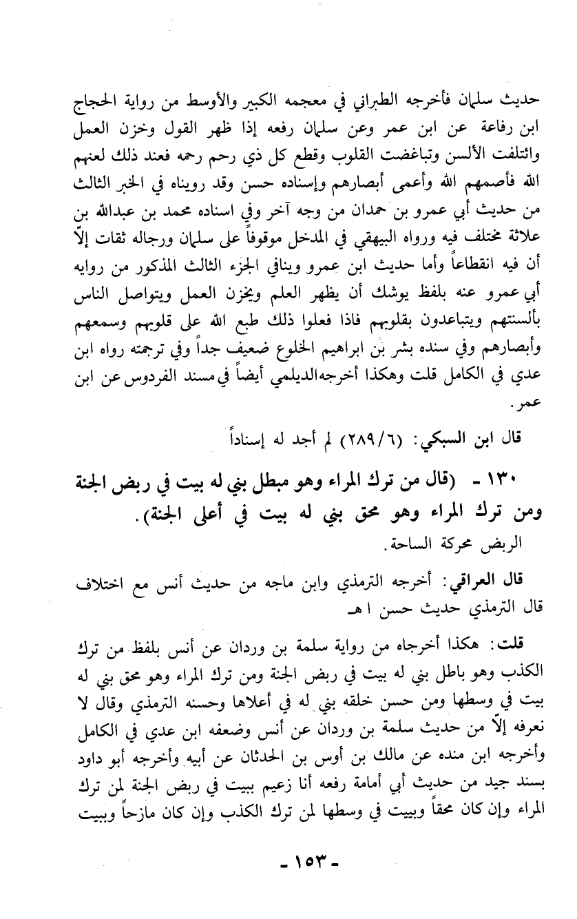 130 - (قال من ترك المراء وهو مبطل بني له بيت في ربض الجنة ومن ترك المراء وهو محق بني له بيت في أعلى الجنة).