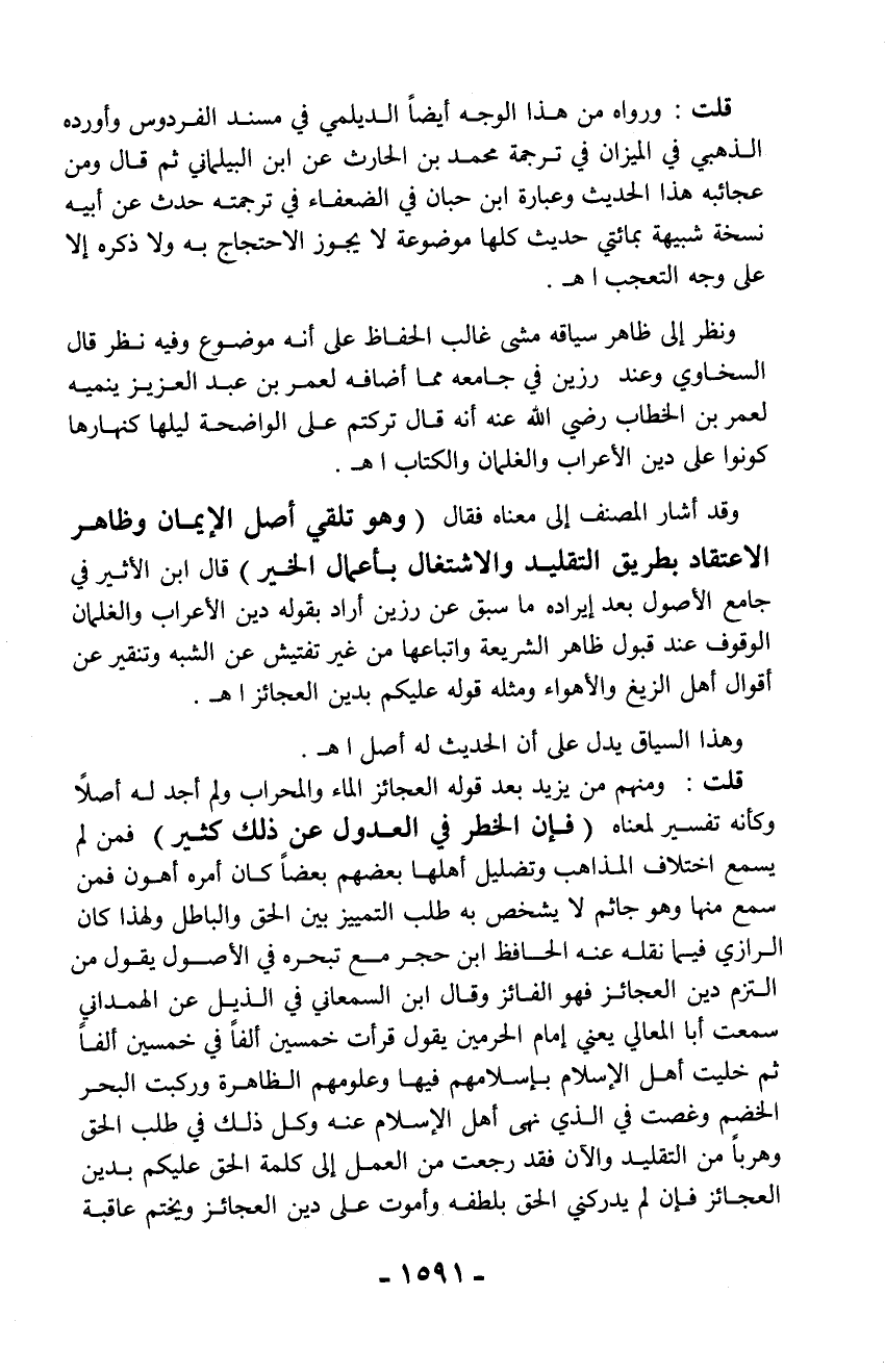 قلت: ومنهم من يزيد بعد قوله العجائز الماء والمحراب ولم أجد له أصلاً وكأنه تفسير لمعناه (فإن الخطر في العدول عن ذلك كثير) فمن لم يسمع اختلاف المذاهب وتضليل أهلها بعضهم بعضاً كان أمره أهون فمن سمع منها وهو جاثم لا يشخص به طلب التمييز بين الحق والباطل ولهذا كان الرازي فيما نقله عنه الحافظ ابن حجر مع تبحره في الأصول يقول من التزم دين العجائز فهو الفائز وقال ابن السمعاني في الذيل عن الهمداني سمعت أبا المعالي يعني إمام الحرمين يقول قرأت خمسين ألفاً في خمسين ألفاً ثم خليت أهل الإسلام بإسلامهم فيها وعلومهم الظاهرة وركبت البحر الخضم وغصت في الذي نهى أهل الإسلام عنه وكل ذلك في طلب الحق وهرباً من التقليد والآن فقد رجعت من العمل إلى كلمة الحق عليكم بدين العجائز فإن لم يدركني الحق بلطفه وأموت على دين العجائز ويختم عاقبة
