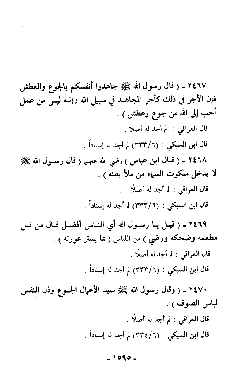2467 - (قال رسول الله - صلّى الله عليه وسلم - جاهدوا أنفسكم بالجوع والعطش فإن الأجر في ذلك كأجر المجاهد في سبيل الله وإنه ليس من عمل أحب إلى الله من جوع وعطش).