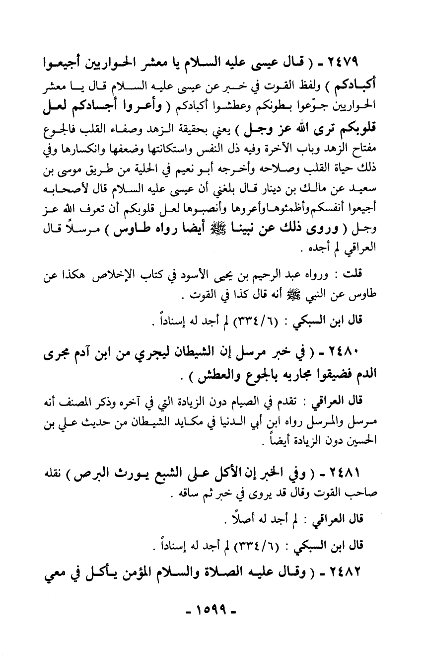 2479 - (قال عيسى عليه السلام يا معشر الحواريين أجيعوا أكبادكم) ولفظ القوت في خبر عن عيسى عليه السلام قال يا معشر الحواريين جوّعوا بطونكم وعطشوا أكبادكم (وأعروا أجسادكم لعل قلوبكم ترى الله عز وجل) يعني بحقيقة الزهد وصفاء القلب فالجوع مفتاح الزهد وباب الآخرة وفيه ذل النفس واستكانتها وضعفها وانكسارها وفي ذلك حياة القلب وصلاحه وأخرجه أبو نعيم في الحلية من طريق موسى بن سعيد عن مالك بن دينار قال بلغني أن عيسى عليه السلام قال لأصحابه أجيعوا أنفسكم وأظمئوها وأعروها وأنصبوها لعل قلوبكم أن تعرف الله عز وجل (وروى ذلك عن نبينا - صلّى الله عليه وسلم - أيضاً رواه طاوس) مرسلاً قال العراقي لم أجده.
