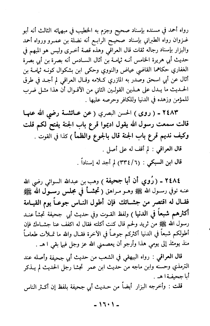 2484 - (رُوي أن أبا جحيفة) وهب بن عبد الله السوائي رضي الله عنه توفي رسول الله - صلّى الله عليه وسلم - وهو مراهق (تجشأ في مجلس رسول الله - صلّى الله عليه وسلم - فقال له اقتصر من جشائك فإن أطول الناس جوعاً يوم القيامة أكثرهم شبعاً في الدنيا) ولفظ القوت وفي حديث أبي جحيفة تجشأ عند رسول الله - صلّى الله عليه وسلم - من ثريد ولحم قال كنت أكلته فقال له اكفف عنا جشاءك فإن أطولكم شبعاً في الدنيا أكثركم جوعاً في الآخرة فقال والله ما تملأت طعاماً منذ يومئذ إلى يومي هذا وأرجو أن يعصمني الله عز وجل فيما بقي اهـ.