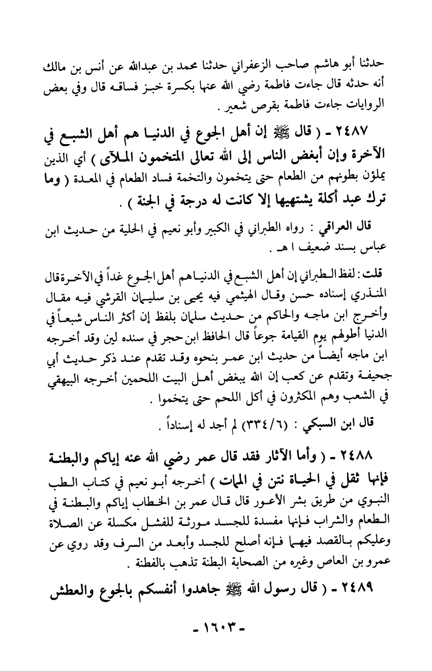 2487 - (قال - صلّى الله عليه وسلم - إن أهل الجوع في الدنيا هم أهل الشبع في الآخرة وإن أبغض الناس إلى الله تعالى المتخمون الملآى) أي الذين يملؤن بطونهم من الطعام حتى يتخمون والتخمة فساد الطعام في المعدة (وما ترك عبد أكلة يشتهيها إلا كانت له درجة في الجنة).