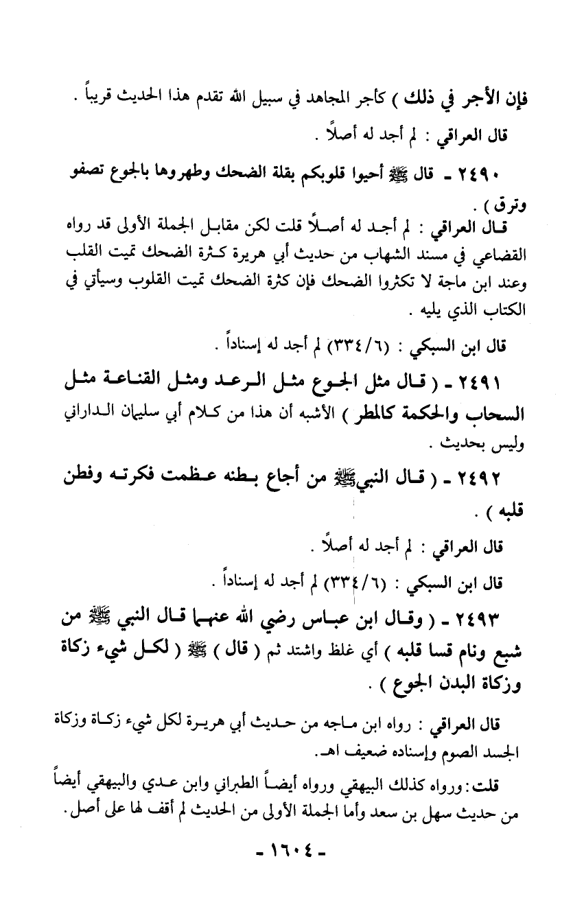 2490 - قال - صلّى الله عليه وسلم - أحيوا قلوبكم بقلة الضحك وطهروها بالجوع تصفو وترق).