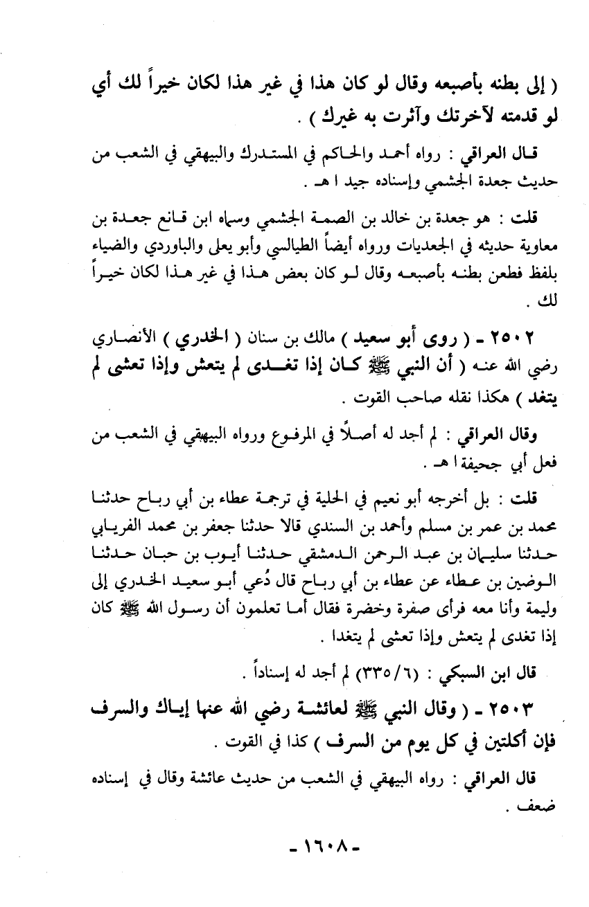2502 - (روى أبو سعيد) مالك بن سنان (الخدري) الأنصاري رضي الله عنه (أن النبي - صلّى الله عليه وسلم - كان إذا تغدى لم يتعش وإذا تعشى لم يتغد) هكذا نقله صاحب القوت.
