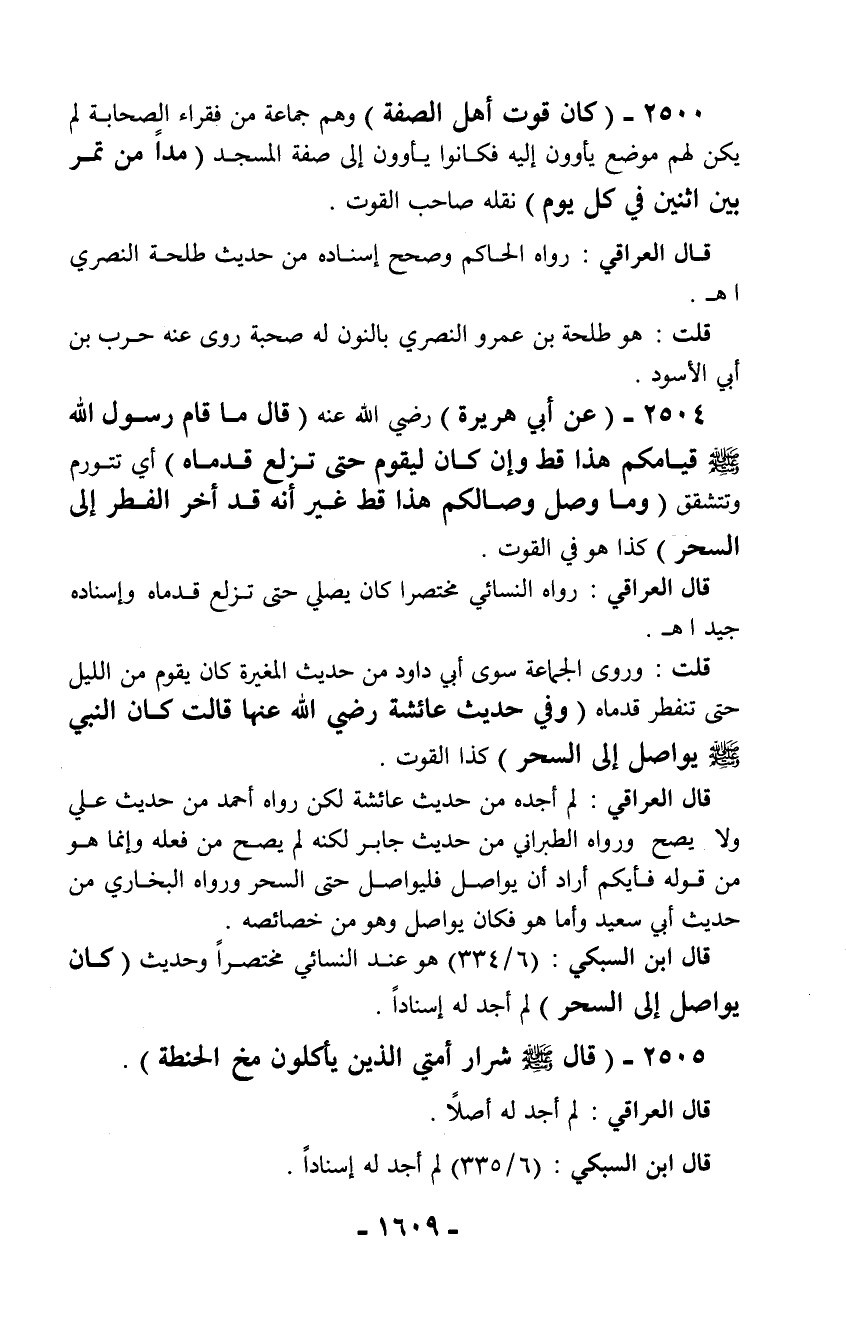 قلت: وروى الجماعة سوى أبي داود من حديث المغيرة كان يقوم من الليل حتى تنفطر قدماه (وفي حديث عائشة رضي الله عنها قالت كان النبي - صلّى الله عليه وسلم - يواصل إلى السحر) كذا القوت.
