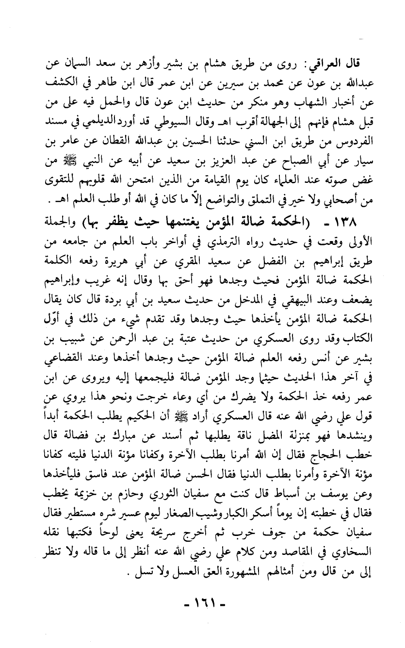 138 - (الحكمة ضالة المؤمن يغتنمها حيث يظفر بها) والجملة الأولى وقعت في حديث رواه الترمذي في أواخر باب العلم من جامعه من طريق إبراهيم بن الفضل عن سعيد المقري عن أبي هريرة رفعه الكلمة الحكمة ضالة المؤمن فحيث وجدها فهو أحق بها وقال إنه غريب وإبراهيم يضعف وعند البيهقي في المدخل من حديث سعيد بن أبي بردة قال كان يقال الحكمة ضالة المؤمن يأخذها حيث وجدها وقد تقدم شيء من ذلك في أوّل الكتاب وقد روى العسكري من حديث عتبة بن عبد الرحمن عن شبيب بن بشير عن أنس رفعه العلم ضالة المؤمن حيث وجدها أخذها وعند القضاعي في آخر هذا الحديث حيثما وجد المؤمن ضالة فليجمعها إليه ويروى عن ابن عمر رفعه خذ الحكمة ولا يضرك من أي وعاء خرجت ونحو هذا يروي عن قول علي رضي الله عنه قال العسكري أراد - صلى الله عليه وسلم - أن الحكيم يطلب الحكمة أبداً وينشدها فهو بمنزلة المضل ناقة يطلبها ثم أسند عن مبارك بن فضالة قال خطب الحجاج فقال إن الله أمرنا بطلب الآخرة وكفانا مؤنة الدنيا فليته كفانا مؤنة الأخرة وأمرنا بطلب الدنيا فقال الحسن ضالة المؤمن عند فاسق فليأخذها وعن يوسف بن أسباط قال كنت مع سفيان الثوري وحازم بن خزيمة يخطب فقال في خطبته إن يوماً أسكر الكبار وشيب الصغار ليوم عسير شره مستطير فقال سفيان حكمة من جوف خرب ثم أخرج سريحة يعني لوحاً فكتبها نقله السخاوي في المقاصد ومن كلام علي رضي الله عنه أنظر إلى ما قاله ولا تنظر إلى من قال ومن أمثالهم المشهورة العق العسل ولا تسل.