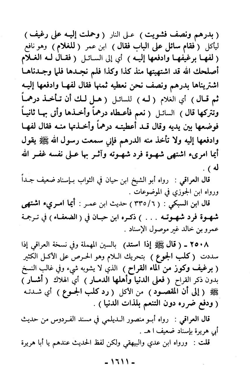 (بدرهم ونصف فشويت) على النار (وحملت إليه على رغيف) ليأكل (فقام سائل على الباب فقال) ابن عمر (للغلام) وهو نافع (لفها برغيفها وادفعها إليه) أي إلى السائل (فقال له الغلام أصلحك الله قد اشتهيتها منذ كذا وكذا فلم نجدها فلما وجدناها اشتريناها بدرهم ونصف نحن نعطيه ثمنها فقال لفها وادفعها إليه ثم قال) أي الغلام (له) للسائل (هل لك أن تأخذ درهماً وتتركها قال) السائل (نعم فأعطاه درهماً وأخذها وأتى بها ثانياً فوضعها بين يديه وقال قد أعطيته درهماً وأخذتها منه فقال لفها وادفعها إليه ولا تأخذ منه الدرهم فإني سمعت رسول الله - صلّى الله عليه وسلم - يقول أيما امرئ اشتهى شهوة فرد شهوته وآثر بها على نفسه غفر الله له).
