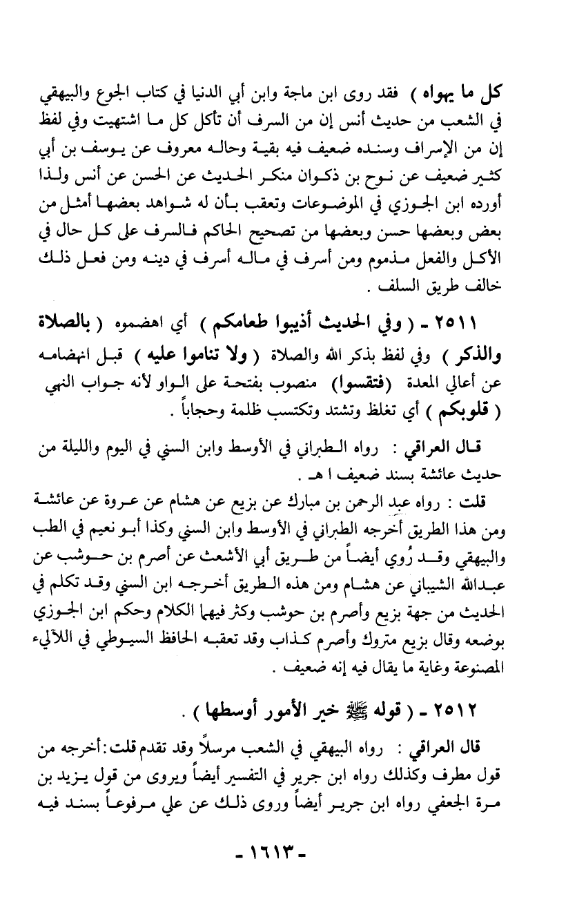 2511 - (وفي الحديث أذيبوا طعامكم) أي اهضموه (بالصلاة والذكر) وفي لفظ بذكر الله والصلاة (ولا تناموا عليه) قبل انهضامه عن أعالي المعدة (فتقسوا) منصوب بفتحة على الواو لأنه جواب النهي (قلوبكم) أي تغلظ وتشتد وتكتسب ظلمة وحجاباً.