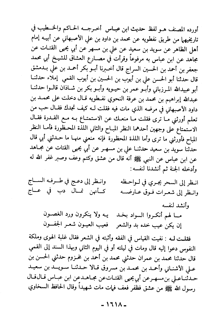 فقلت له: نفيت القياس في الفقه وأثبته في الشعر فقال غلبة الهوى وملكة النفوس دعوا إليه قال ومات في ليلته أو في اليوم الثاني وبهذا السند إلى القمي قال حدثنا محمد بن عمران حدثني محمد بن أحمد بن مخزوم حدثني الحسن بن علي الأشناني وأحمد بن محمد بن مسروق قالا حدثنا سويد بن سعيد حدثنا علي بن مسهر عن أبي يحيى القتات عن مجاهد عن ابن عباس قال قال رسول الله - صلّى الله عليه وسلم - من عشق فظفر فعف فمات مات شهيداً وقال الحافظ السخاوي