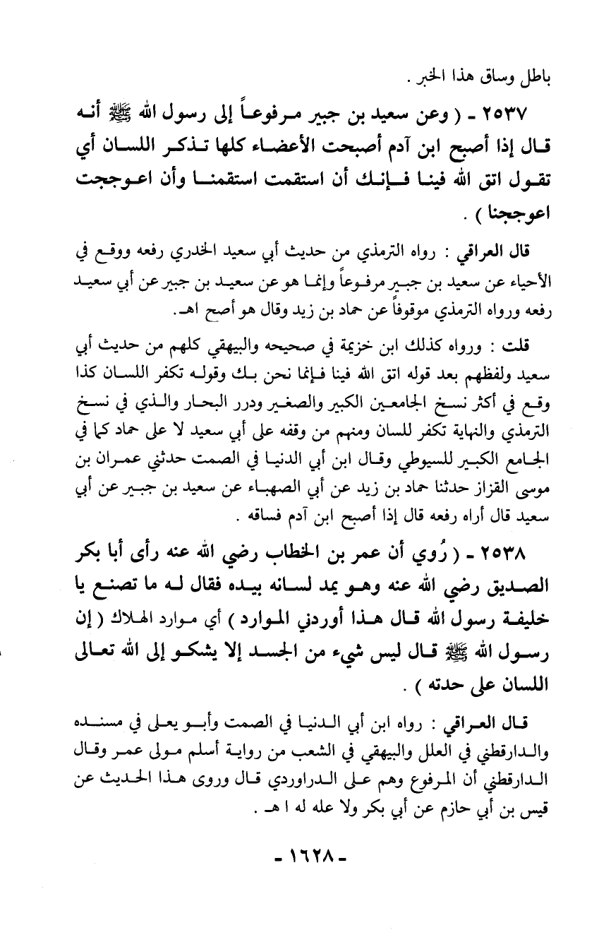 2537 - (وعن سعيد بن جبير مرفوعاً إلى رسول الله - صلّى الله عليه وسلم - أنه قال إذا أصبح ابن آدم أصبحت الأعضاء كلها تذكر اللسان أي تقول اتق الله فينا فإنك إن استقمت استقمنا وإن اعوججت اعوججنا).
